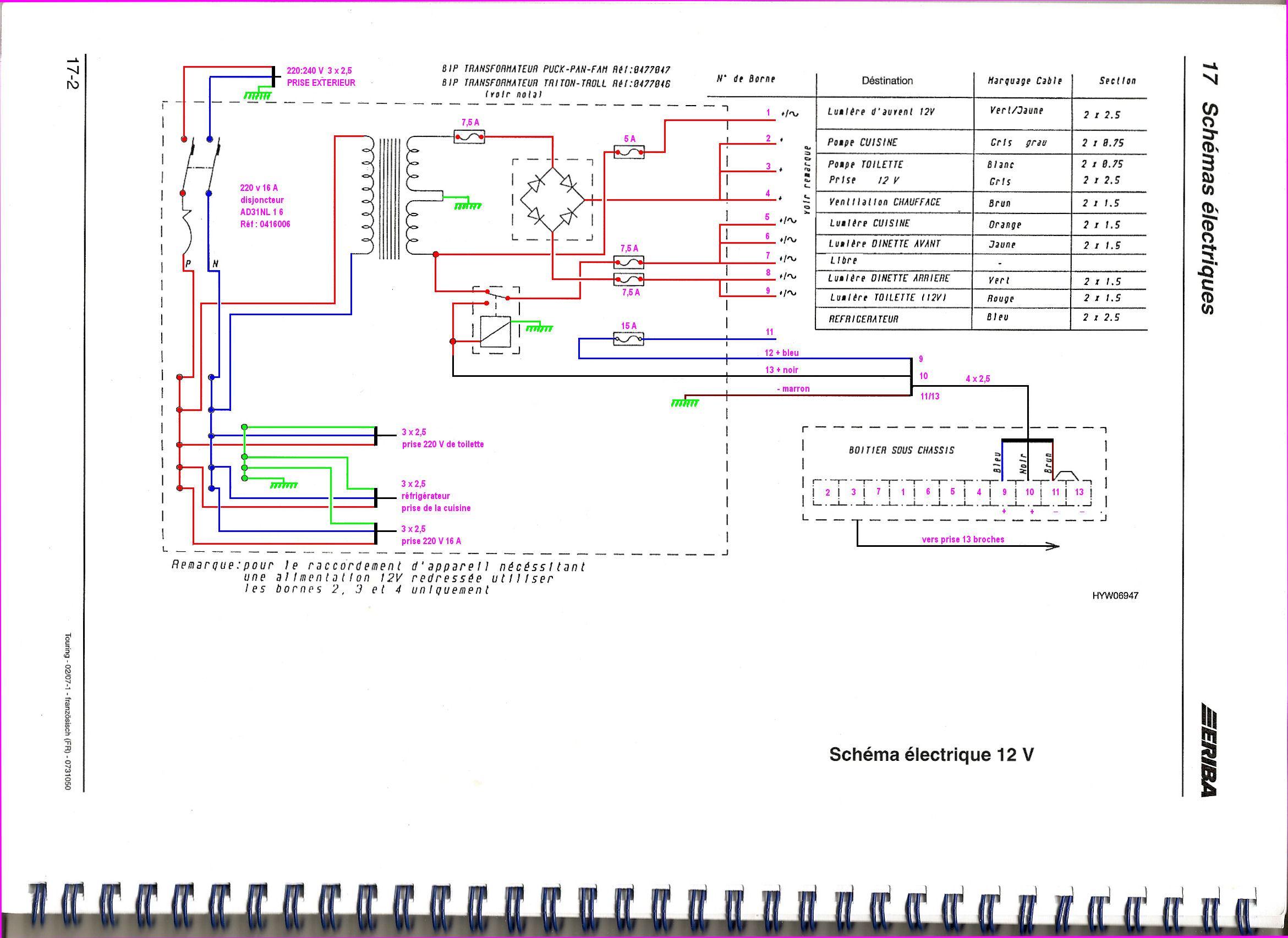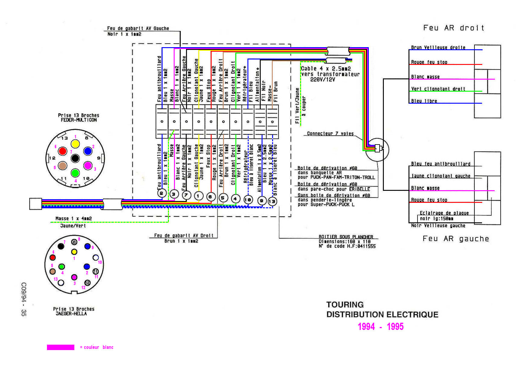 voici le schéma électrique de cablage en 12 volts avec les prises Feder-Multicon (7+6) ou Jaeger-Hella (13)