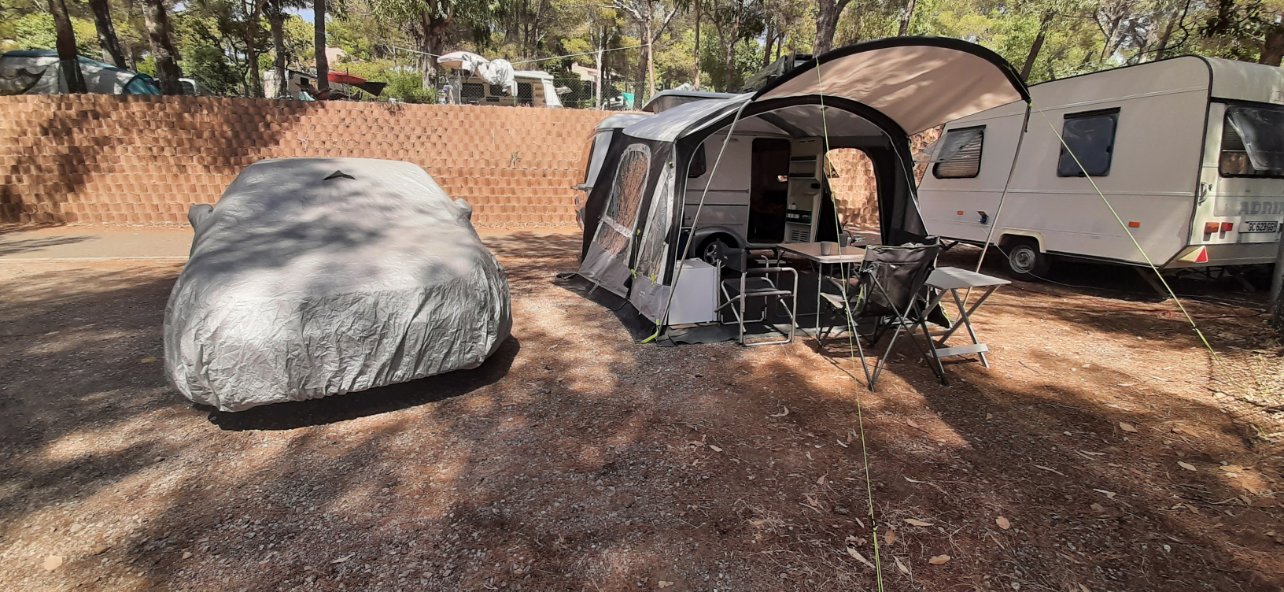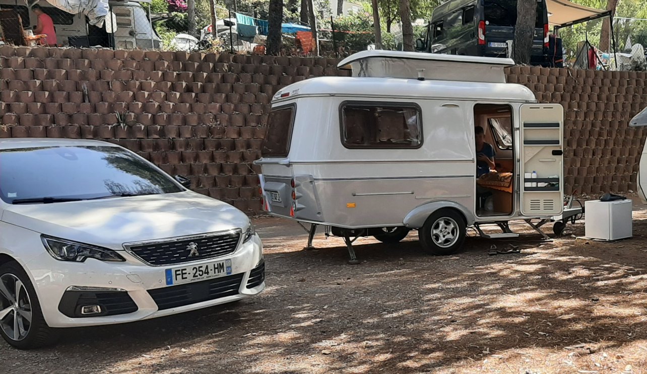 la caravane devant notre maison (avec le bas de mur couleur sable)