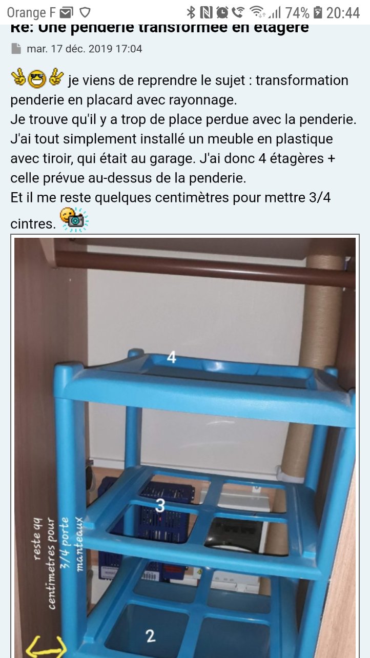 Je trouve qu'il y a trop de place perdue avec la penderie. J'ai tout simplement installé un meuble en plastique avec tiroir, qui était au garage. J'ai donc 4 étagères + celle prévue au-dessus de la penderie.