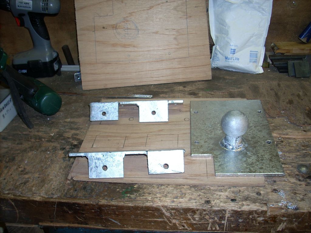2 bouts de cornières boulonnées sur le timon, une platine (vissée sur les cornières) sur laquelle est soudée une boule d'attelage, l'ensemble galvanisé.