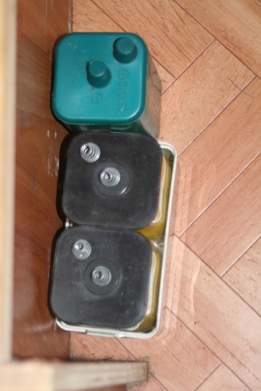 Voila ce que j'ai découvert : Les "trucs" qu'on voit en bas (sous le capot rouge et au-dessus) semblent être des vieilles batteries ou des piles (2 sous le capot et 1 en rabe).
