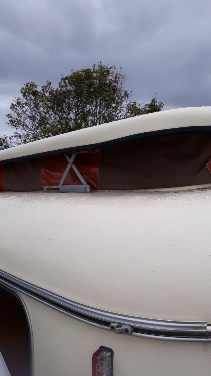 4°) déposer le toit et la toile. Aucune difficulté à deux personnes. J'avais positionné deux bouts de bois en travers entre le toit et la caravane pour porter le toit avec un bonhomme de chaque côté.