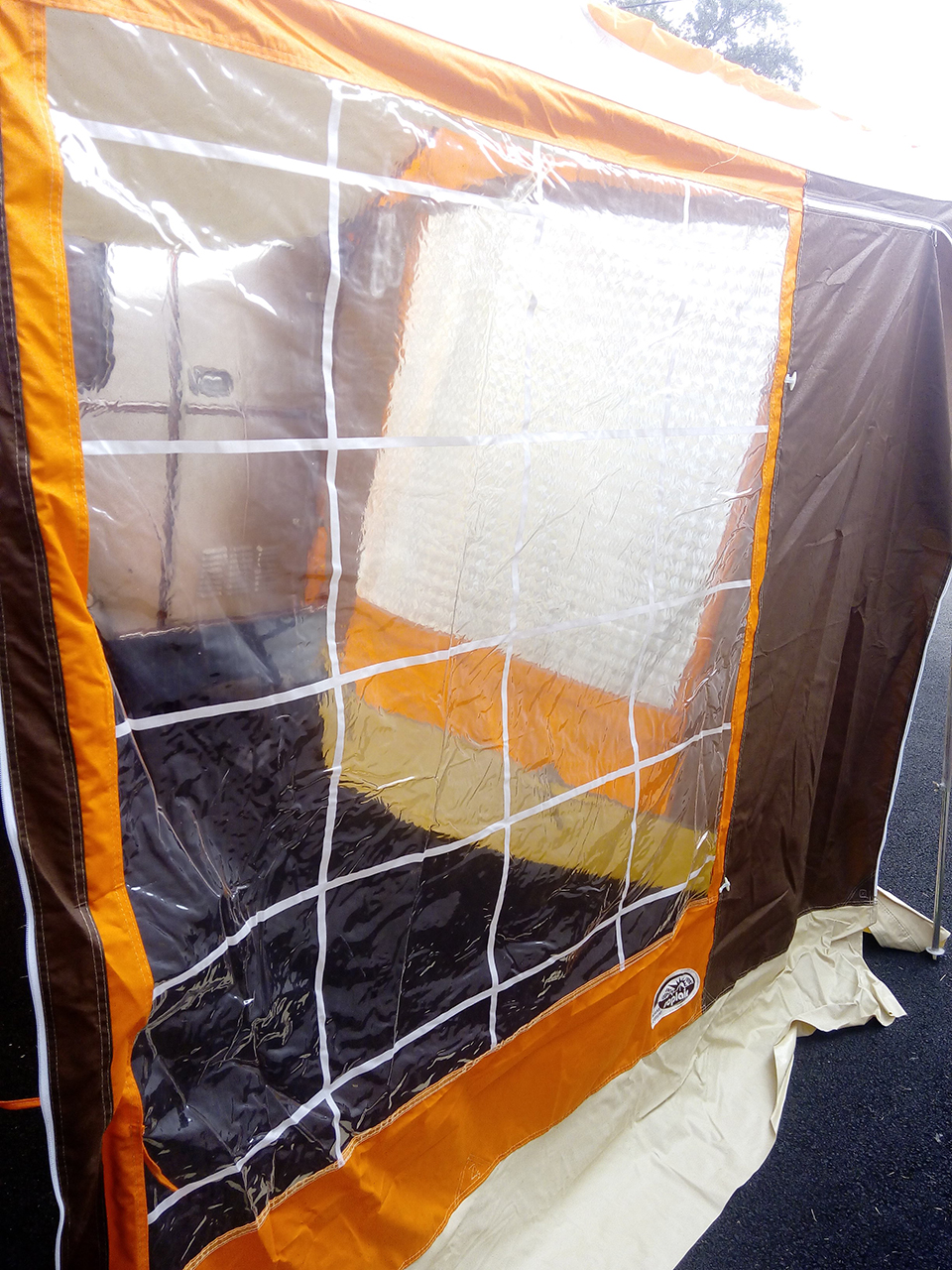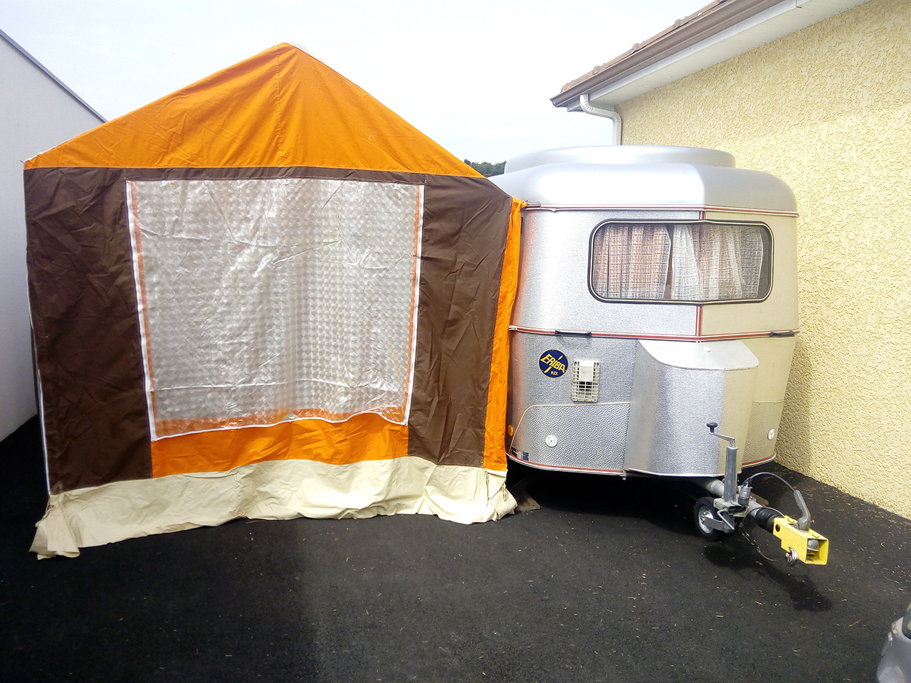 J'ai deplié l'auvent de "Polette" pour lui faire un essai après les stores. A priori il est tout neuf ! je pensais m'en séparer pour du "plus pratique" mais vu l'état et au final pas compliqué à monter (même pour une première fois sans notice … bon j'ai pas passé le bourrelet de tissu dans le rail de la caravane dès le début mais maintenant je saurais
