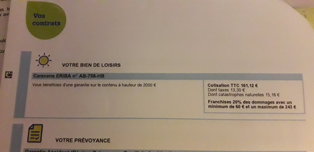 "Le contenu de la caravane et l'auvent sont garantis à concurrence de 3500 €" pour une cotisation annuelle de 137,67 €