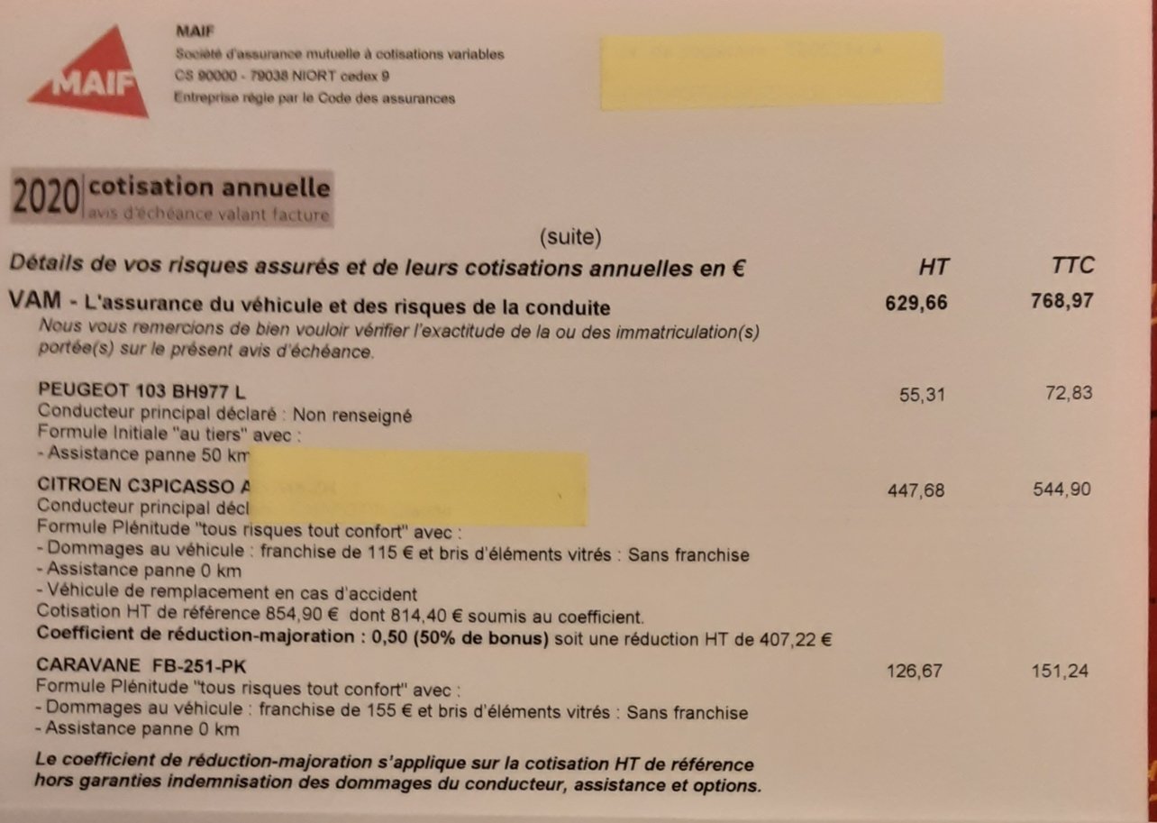 Pour faire suite à mon incident de parcours sur la carabane Troll de 2012 (dégâts sur le pare choc arrière) je viens de voir que je ne suis assuré chez Allianz (324 € / an) que au tiers et avec une franchise de 499 €, soit le prix d'achat du pare choc.