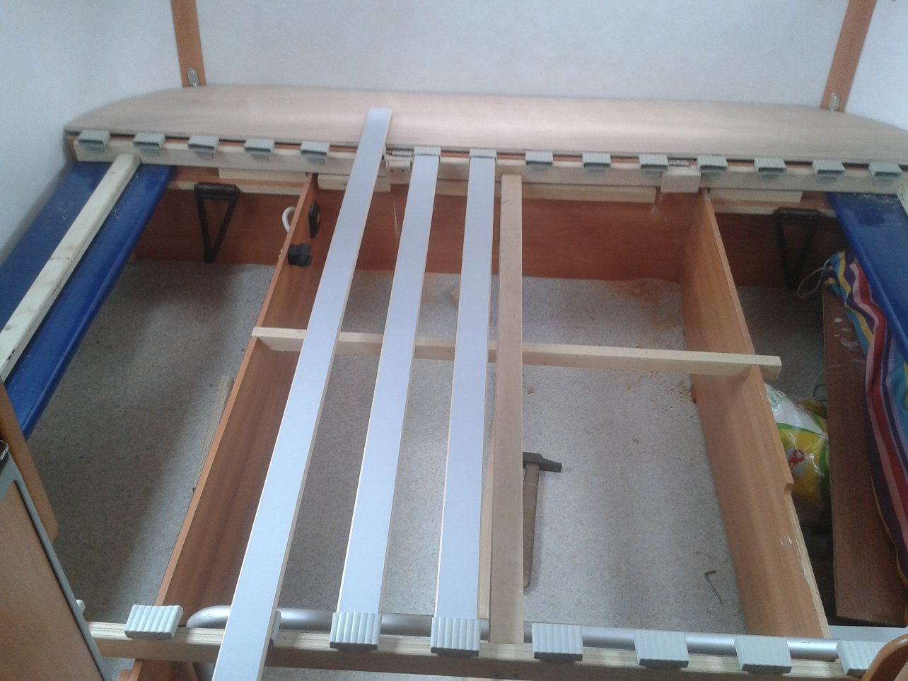 Objectif: un lit fixe articulé au milieu afin d'avoir accès à la soute arrière ( chauffe eau) et aux soutes avant. et le tout sans trop faire de trous dans la : eriba :