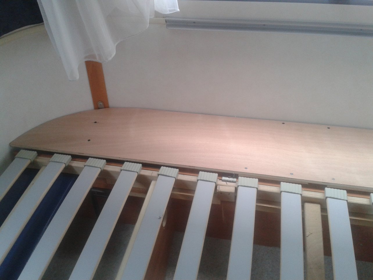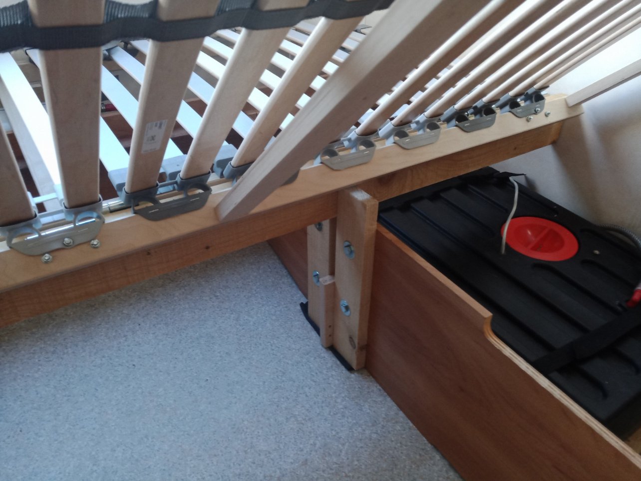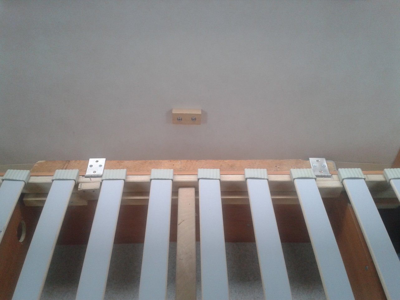j ai calé la plaque à hauteur du sommier latte en la laissant mobile posée sur le tasseau de renfort des charnières tout en gardant les pattes en acier d'origine des extrémités