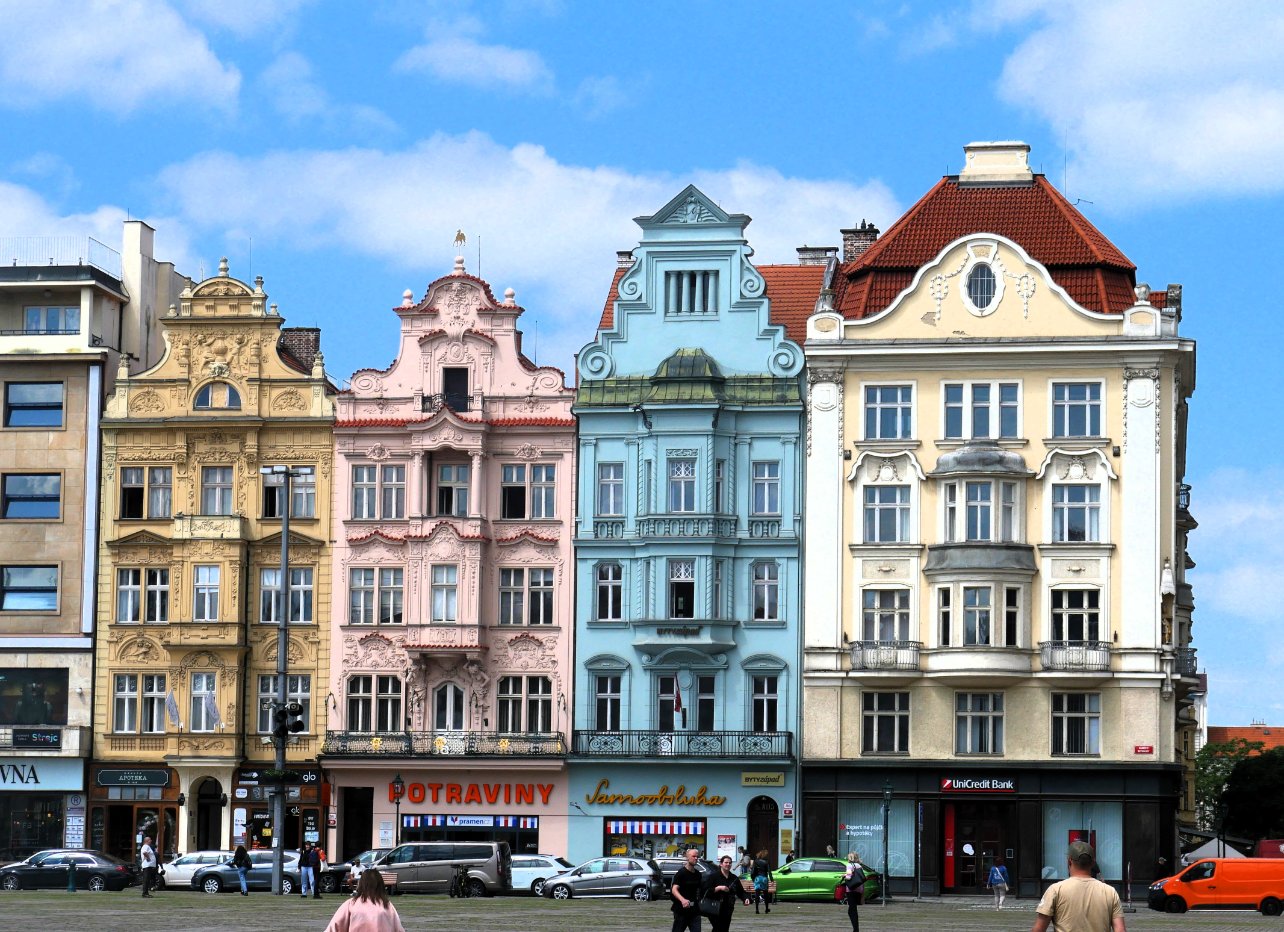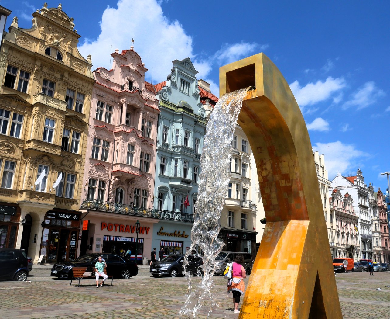 Très jolie place à Pilsen avec les fontaines en or !