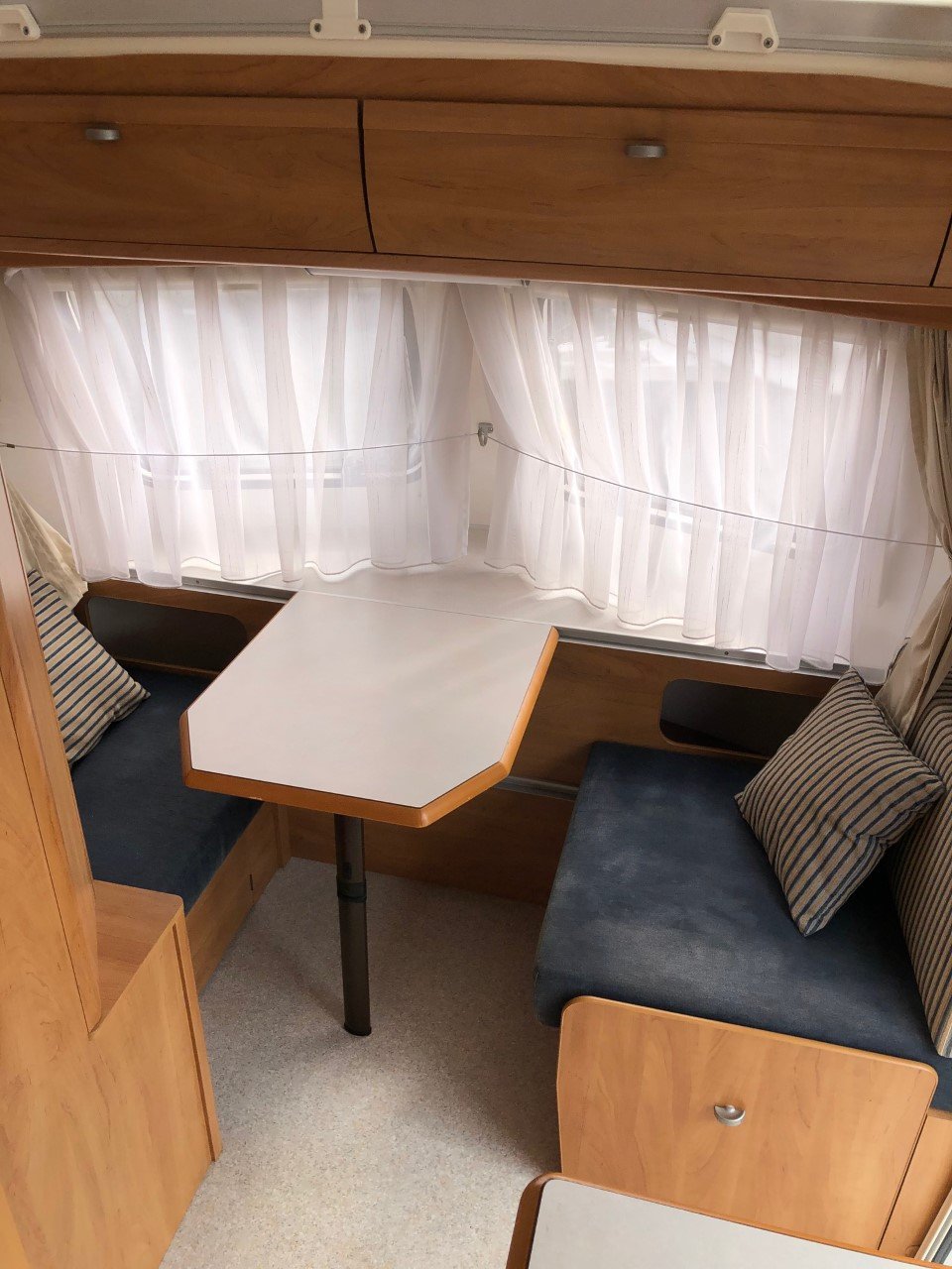 Il s'agissait d'une caravane familliale Burstner comprenant 5 couchages. Elle était spacieuse mais lourde et difficile à tracter. Après quelques années d interruption ou nous avons privilégié les locations de gite , l envie de posséder à nouveau une caravane nous a repris mais en réduisant les contraintes de traction. N 'étant plus qu'à deux, et voulant un modéle maniable afin de pouvoir bouger facilement, notre choix s'est arrété sur une Eriba Triton 430 GT car nous voulions un lit tout fait. Notre recherche a démarré au printemps 2019 et après plusieurs mois de consultations de petites annonces, nous avons trouvé le modèle en Normandie à 2 h de chez nous. Nous l'avons acheté en aout 2019 et c 'est un modèle de 2007, fabriqué à Cernay. C'était une premiére main et les anciens propriétaires étaient très soigneux, elle est comme neuve ! Nous envisagions de l'inaugurer la deuxième quinzaine de mai mais ce n 'est plus à l'ordre du jour , on espère encore pour cet été ...