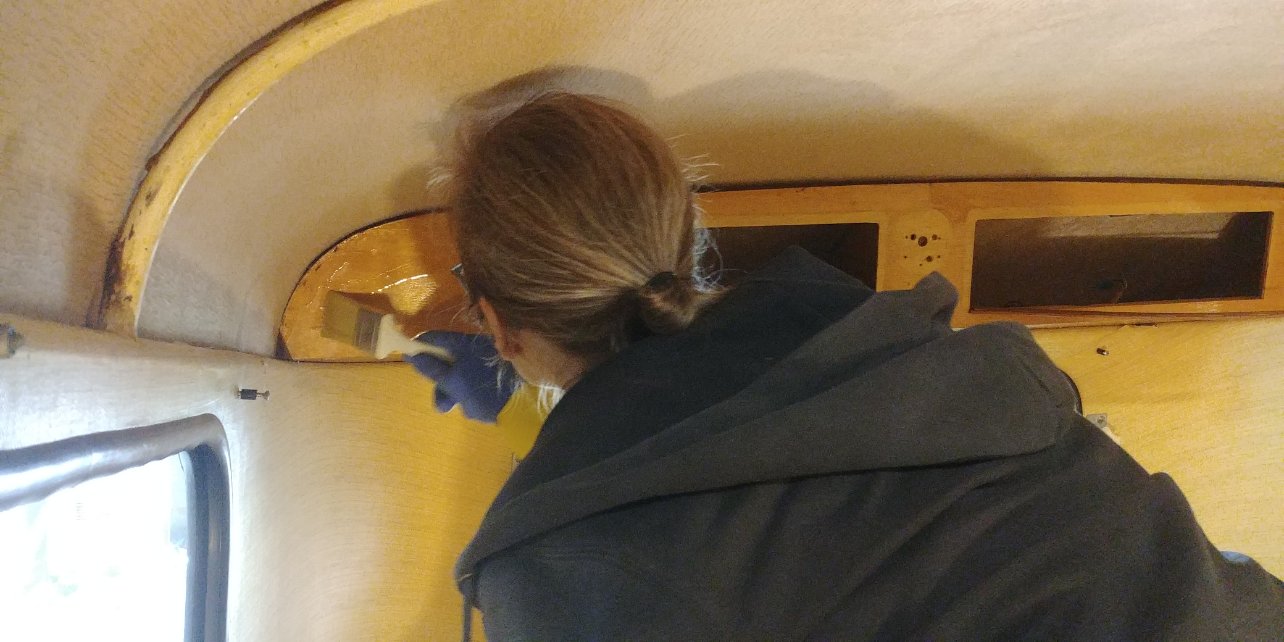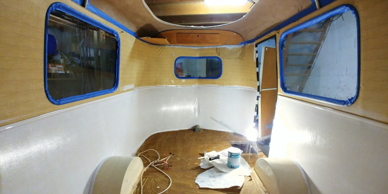 En attendant mise en peinture de l'intérieur en toile plastique. Première couche.