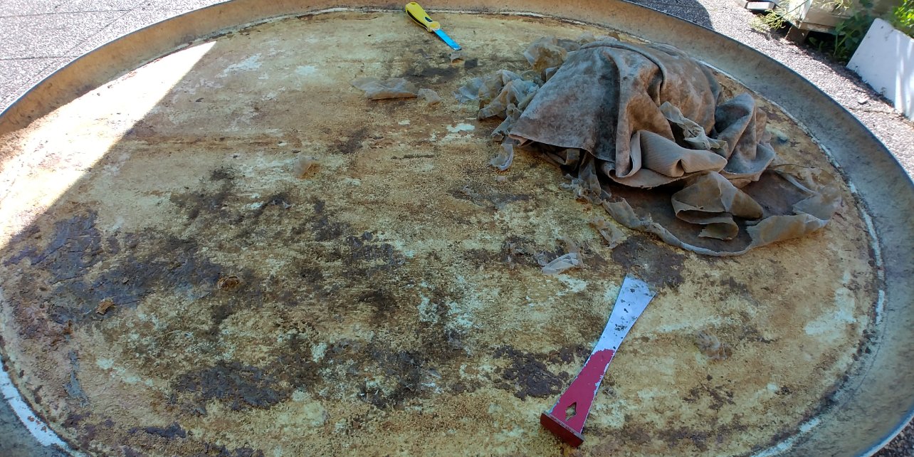 Bon, pour enlever complètement la toile, je dois démonter la structure en métal du toit. C'est pas gagné. Les vis sont rouillées et prise dans plusieurs couches de peintures. Heureusement mon voisin à eu la bonne idée de faire sauter les anneaux afin de pouvoir dévisser plus facilement à la pince.