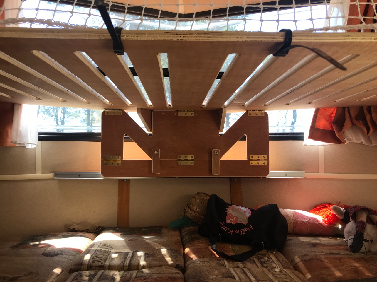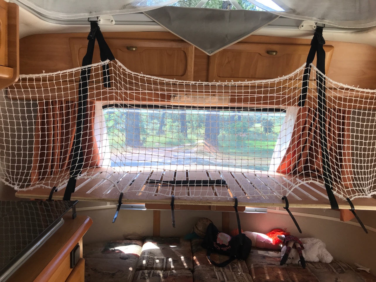 Filet acheté sur le net, des sangles de fixation de recup’ et quelques colliers pour fixer le tout