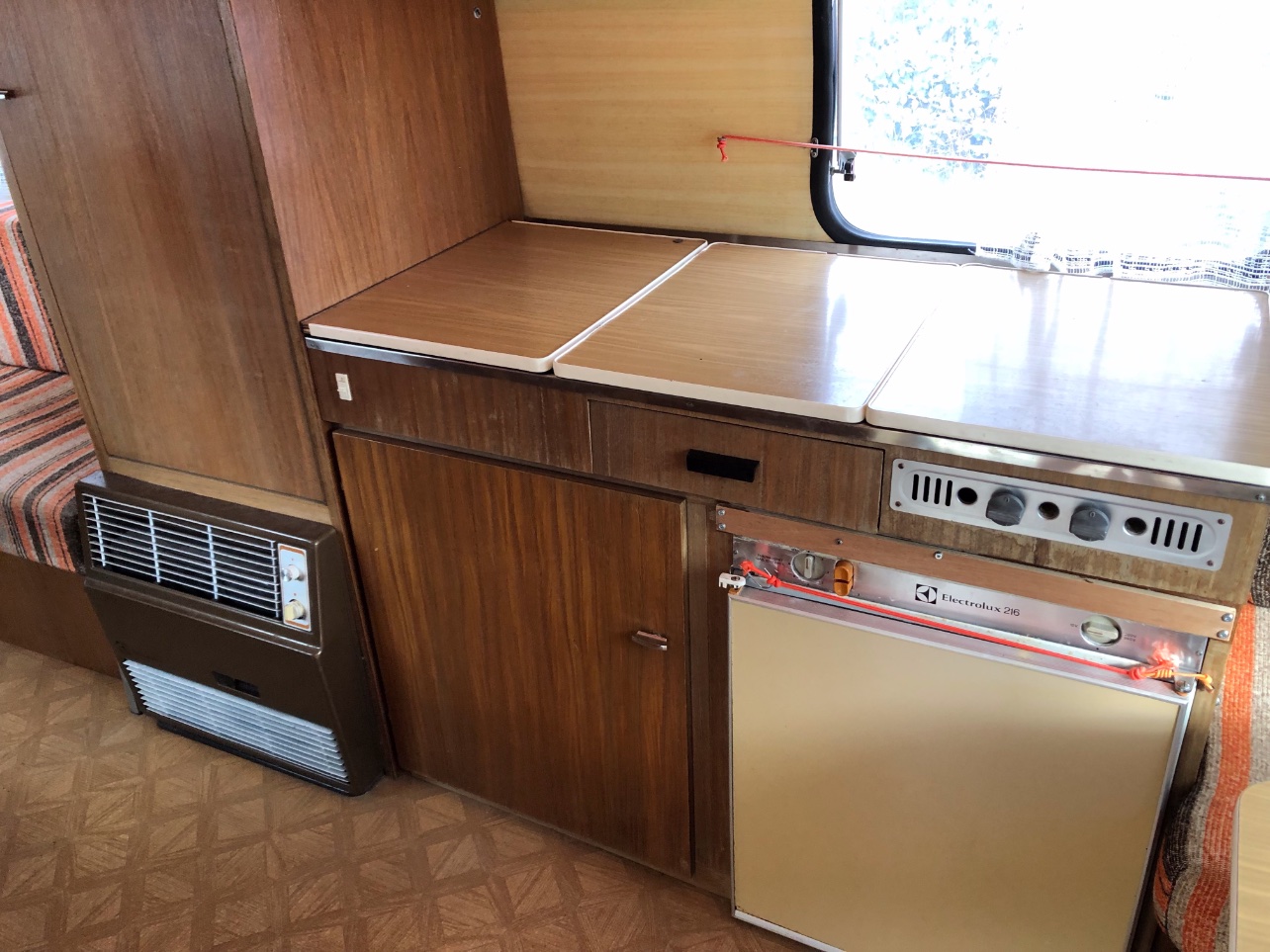 me souvient pas que Eriba ai monté ce type de chauffage d'origine , donc a été rajouté par la suite , suffit de voir la couleur des planches au dessus tout comme le frigo ..