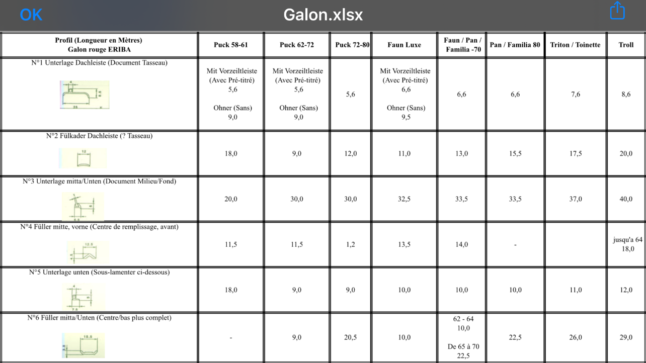 J’ai également repris le tableau des longueurs de galon (trouvé sur le forum) en fonction des modèles