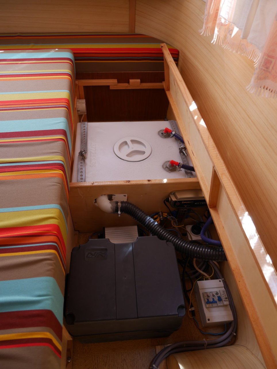 Côté chauffage, dépose de l'ancien Truma et sa sortie sous plancher hasardeuse, pose d'un panneau de fermeture en remplacement de la niche et "bouchage" du trou
