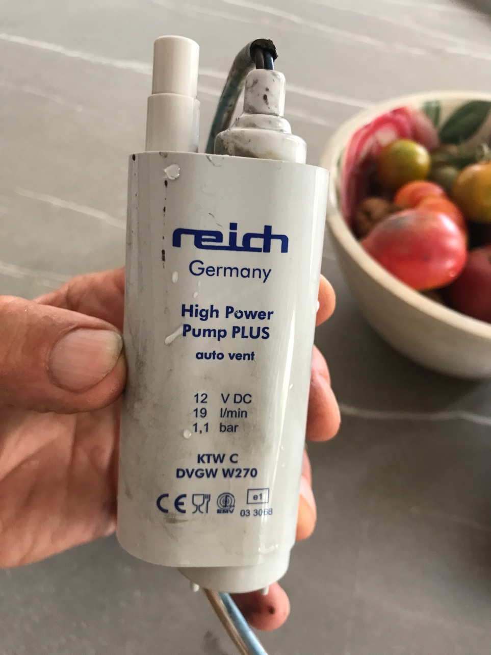 Allez à mon tour d'avoir la pompe d'origine (2012) Reich 19l/mn - 1,1 bar HS. Le jus arrive bien avec robinet ouvert mais sans action. j'ai coupé le fil d'alimentation pour le sortir du couvercle d'obturation de la cuve. En tirant sur la gaine transparente... un jus noir qui tache est sorti ! Donc le moteur électrique devait baigner dans l'eau 😫.