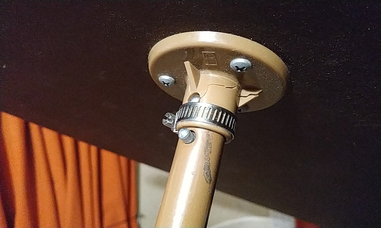 L'avantage de ce type de pied (identique à celui monté sur mes tables) est qu'il est réglable en hauteur, très utile lorsque la table est accrochée dehors, voir même lors d'un repas sur la dinette, lorsque laest en pente....
