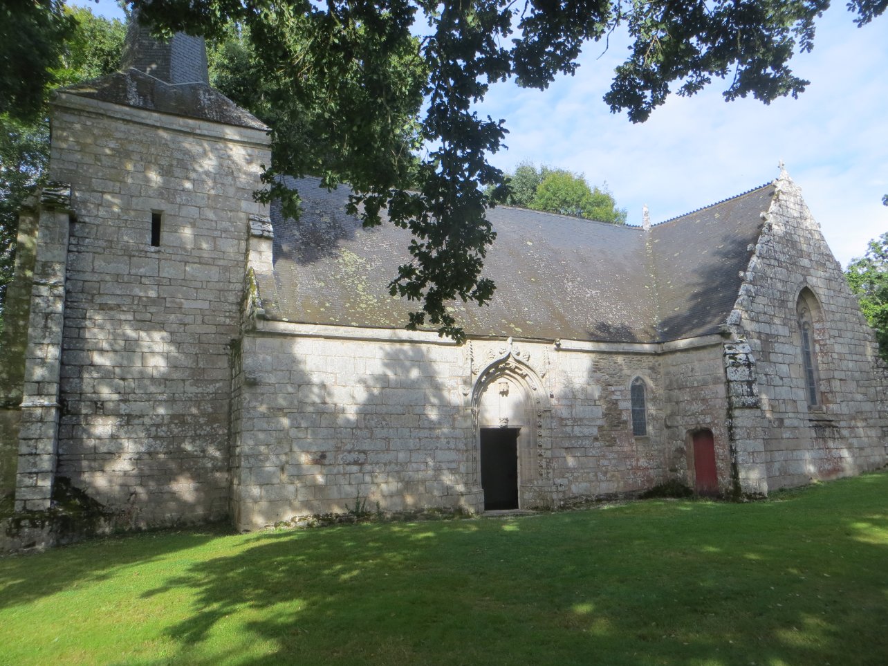 L'église est particulièrement intéressante en raison de ses peintures murales. Chapelle en forme de croix latine avec chevet plat. Les façades sont traitées en style fin 15e début 16e siècle, en granit avec de grandes verrières garnies de réseaux et de vitraux. Le bras sud du transept conserve des vitraux exécutés en 1552. Selon la légende, Saint-Mériadec s'y recueillit dans la solitude autour de 650, avant de devenir évêque de Vannes. Une clochette intitulée "Bonnet de Saint-Mériadec", datée des 10e - 12e siècles, y est conservée. Posée sur la tête des sourds, elle était sensée apporter leur guérison. Dans le chœur, des peintures murales représentent la vie du saint, disposées sur deux registres et groupées par quatre.