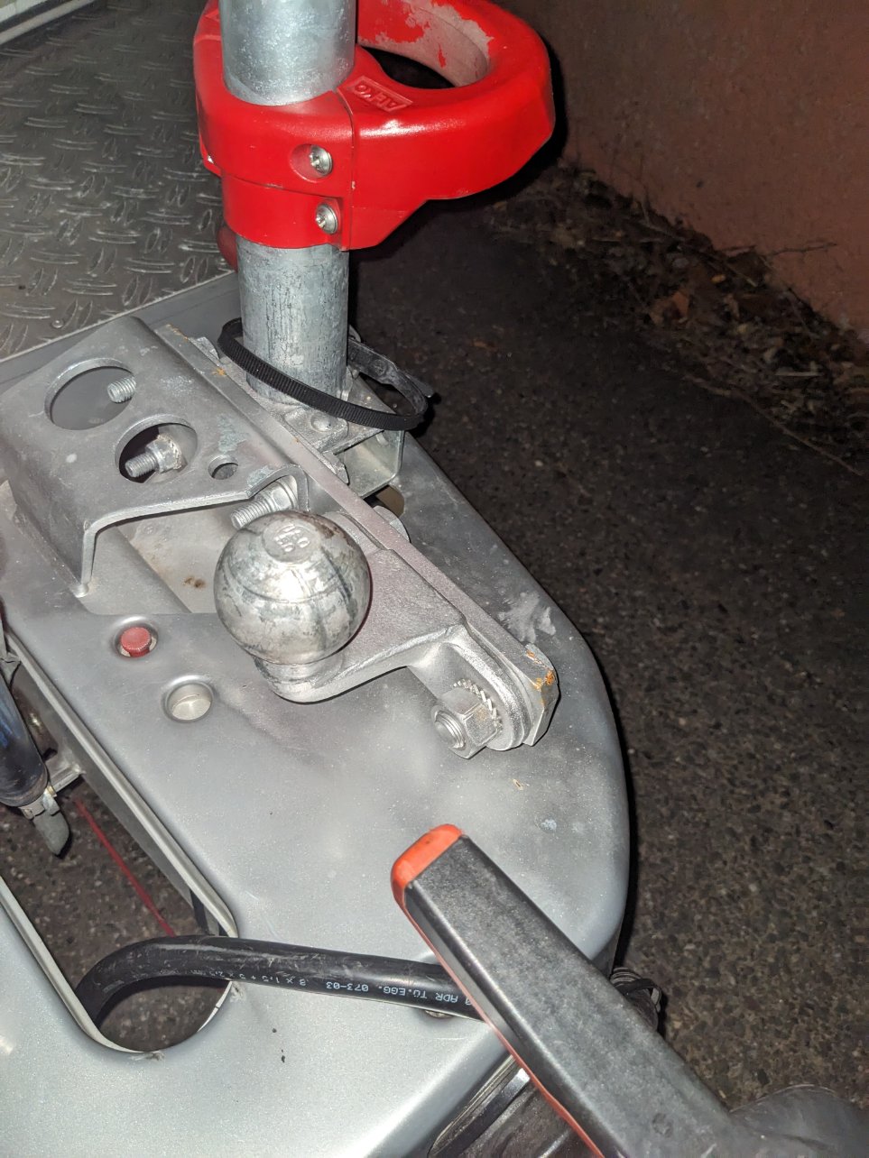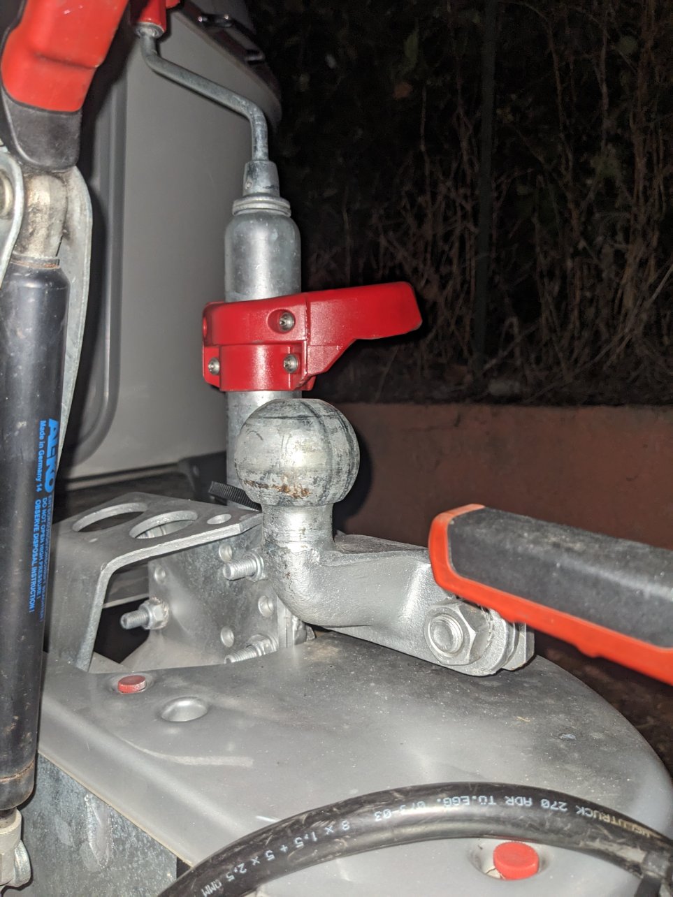 On a également une boule d'attelage vissée au milieu du timon. On y a pour l'instant accroché un porte vélos Thule en tenailles pour 2 vélos, max 30 kilos, et on n'y a mis qu'un des deux VTTs sans la batterie (donc 18 kilos environ) et miracle, plus de lacets depuis... Ouf !