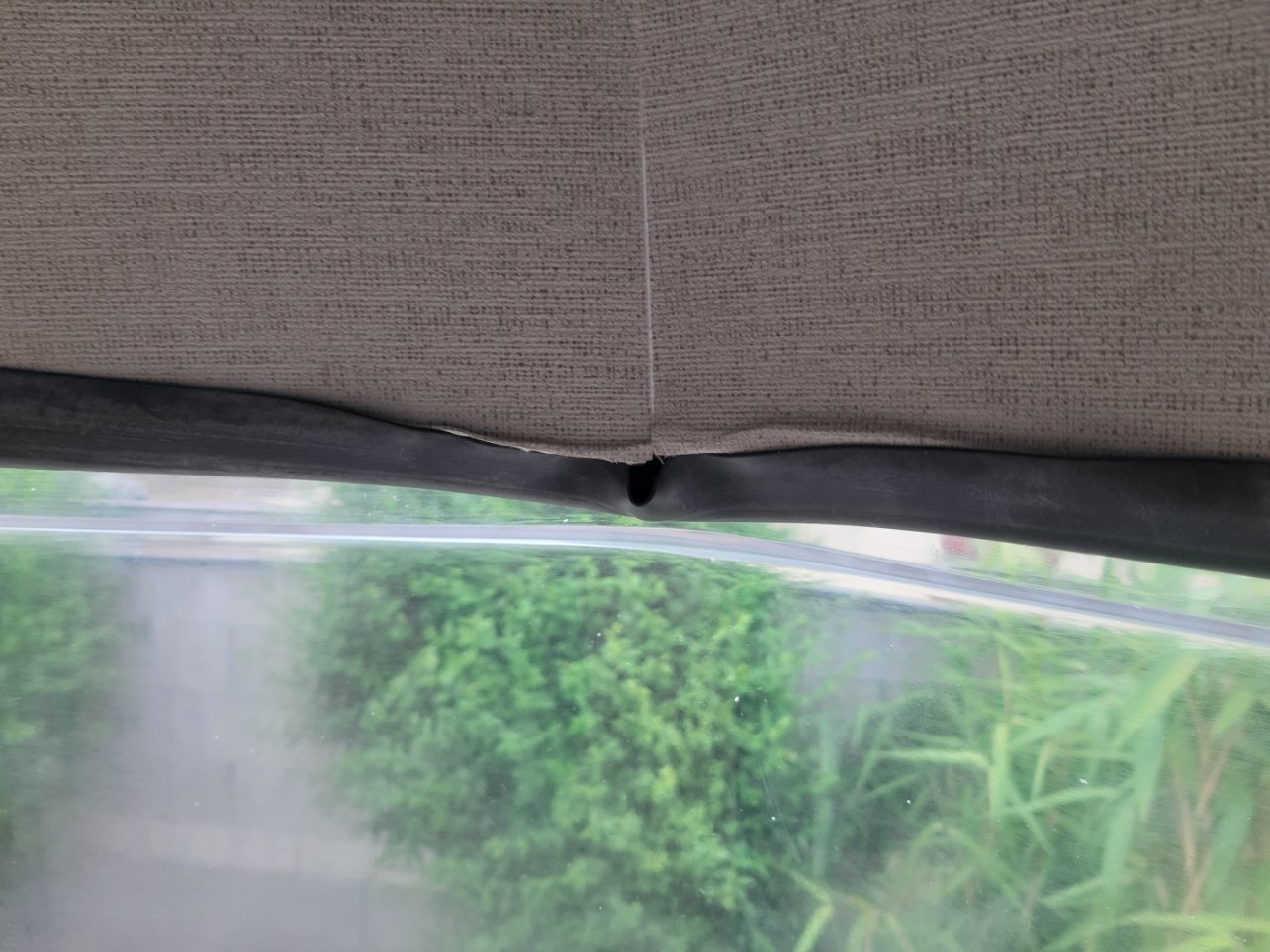 Le joint ( noir) semble en bon état mais semble rétréci juste dans l'angle supérieur haut extérieur ne chevauchant le vitre que d'un ou deux millimètres.