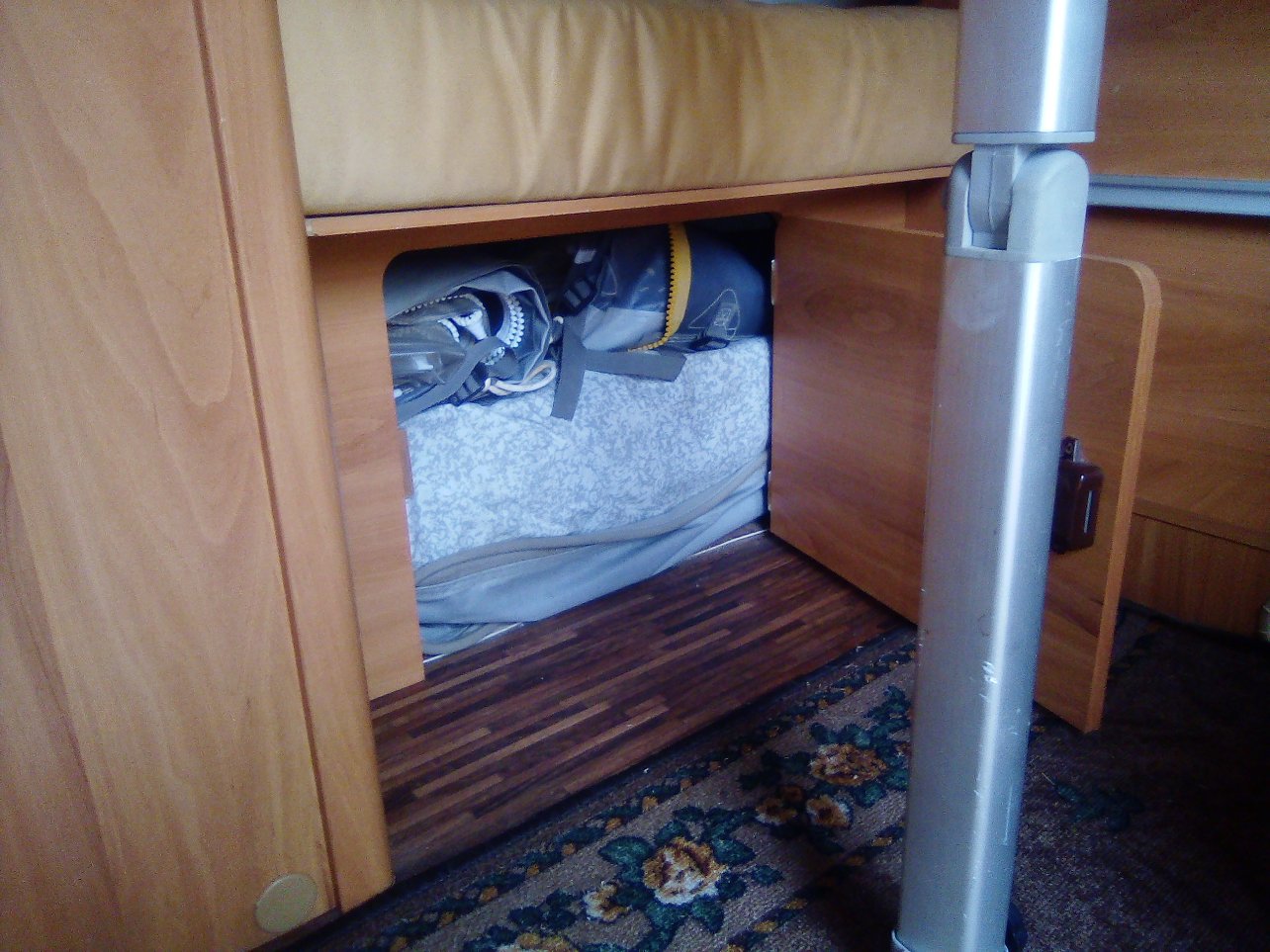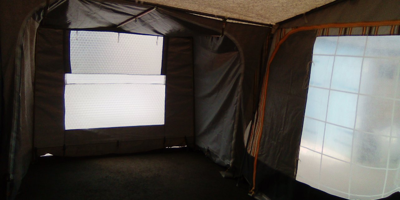 Le lit paskingsize... faut pas être gros, ni grand :/ mais ça va pour nous, on y loge bien. Les tissus rouge/rose sont des rajouts (c'est pas mal pour limiter un peu la luminosité et l'entrée du chaud ou du froid). C'est bien fait car dé-scratchable...