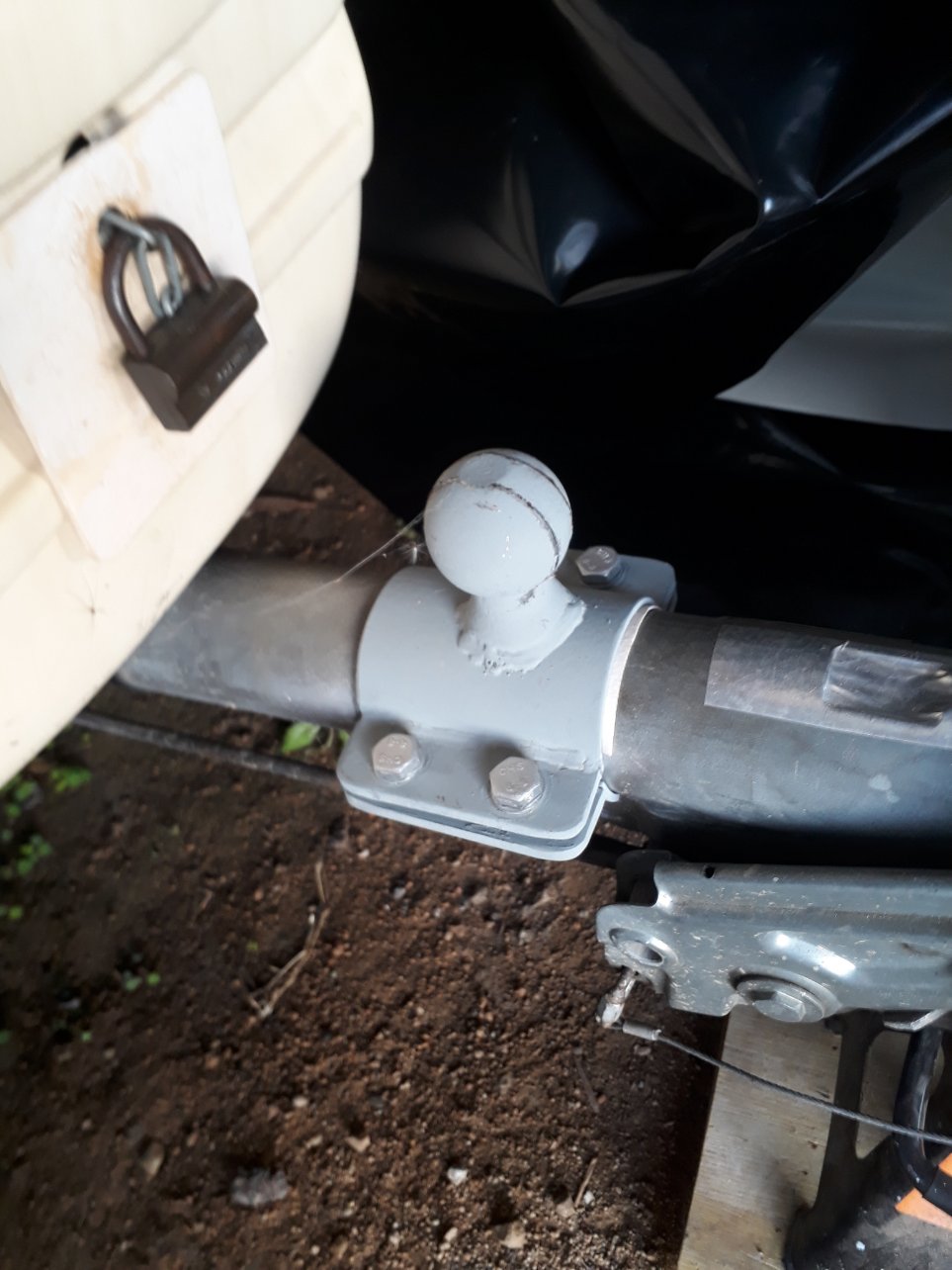 Alors en fait cette photo présente l'état de mon Eriba lors de son achat ! Ce que l'on voit sur le timon est un support pour antenne TV qu'utilisait le précédent propriétaire. Je l'ai enlevé pour mettre 2 demi-cylindres boulonnés avec une boule d'attelage soudée. Je mettrai une photo à l'occasion ;) .