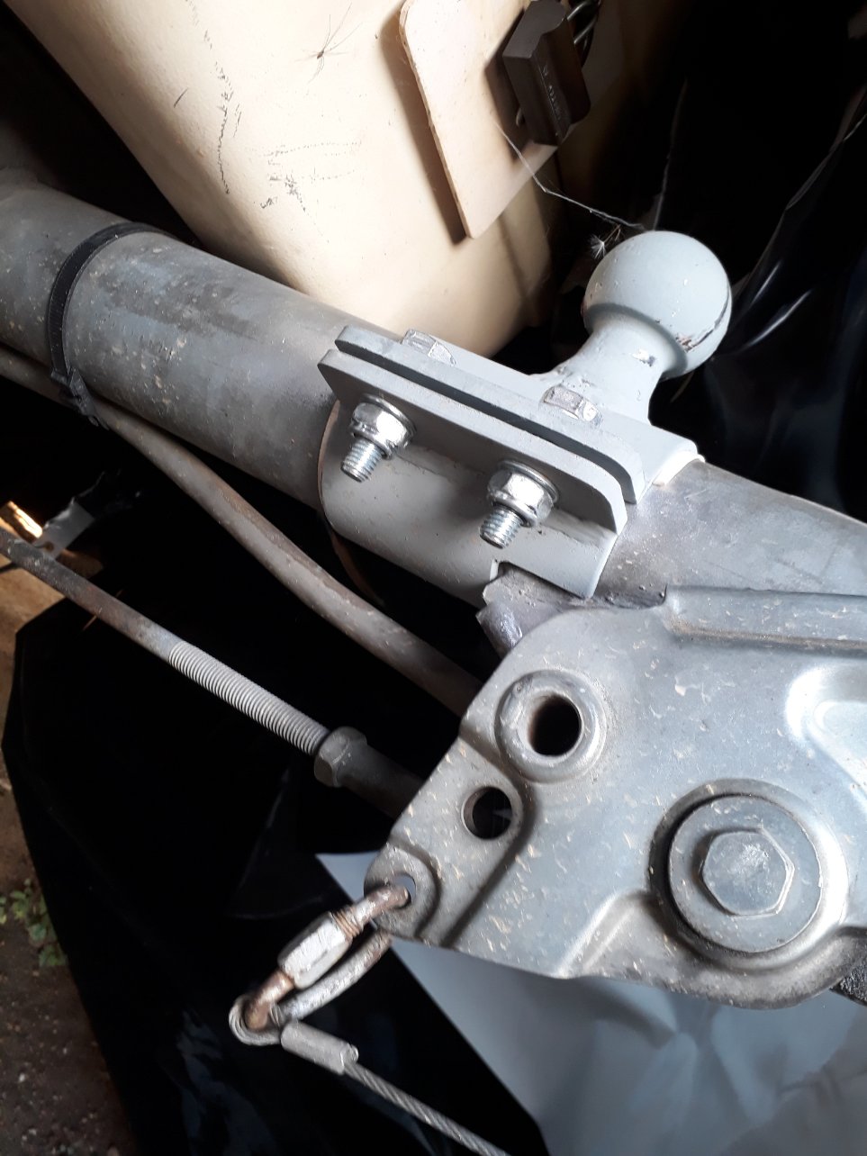 Alors en fait cette photo présente l'état de mon Eriba lors de son achat ! Ce que l'on voit sur le timon est un support pour antenne TV qu'utilisait le précédent propriétaire. Je l'ai enlevé pour mettre 2 demi-cylindres boulonnés avec une boule d'attelage soudée. Je mettrai une photo à l'occasion ;) .