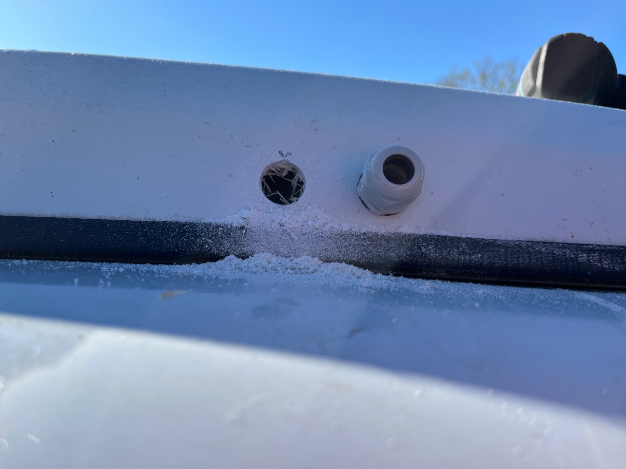 Passage sur le toit et perçage de celui ci , grand moment de solitude, je passe à raz d’un renfort métallique.