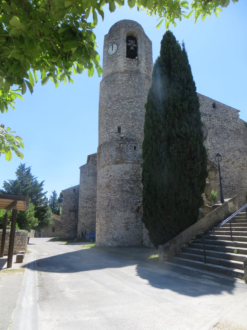 19.06 ST VERAN (Aveyron), son église séparé du village qui lui se trouve en haut accroché à ses rochers ruiniformes dominant la vallée de la Dourbie.