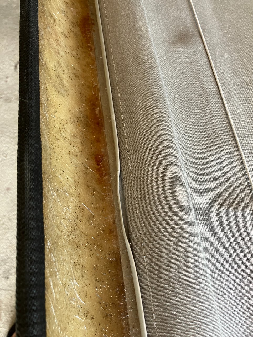 D'abord protéger la toile : Un demi-kilo de résine et quelques mètres de mat ont été nécessaires : Le mat et la résine viennent recouvrir la partie du cadre alu qui est en contact avec le toit. Pour ceux qui n'ont jamais fait, il faut déposer de la résine avec un gros pinceau, puis le mat qu'on vient tapoter (toujours avec le pinceau) pour l'inprégner et lui donner la forme (et chasser les bulles d'air éventuelles), en rajoutant au besoin de la résine pour que le mat soit bien recouvert. Par endroit (notamment du côté des poignées, là où on tire beaucoup), deux voire trois couches de mat.