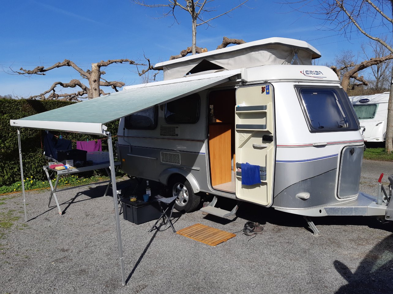 Bonjour, oui esthétiquement, belle harmonie, sur votre Eriba. Le mien est posé un chouilla plus en avant, ce qui recouvre presque la totalité de la porte ouverte.