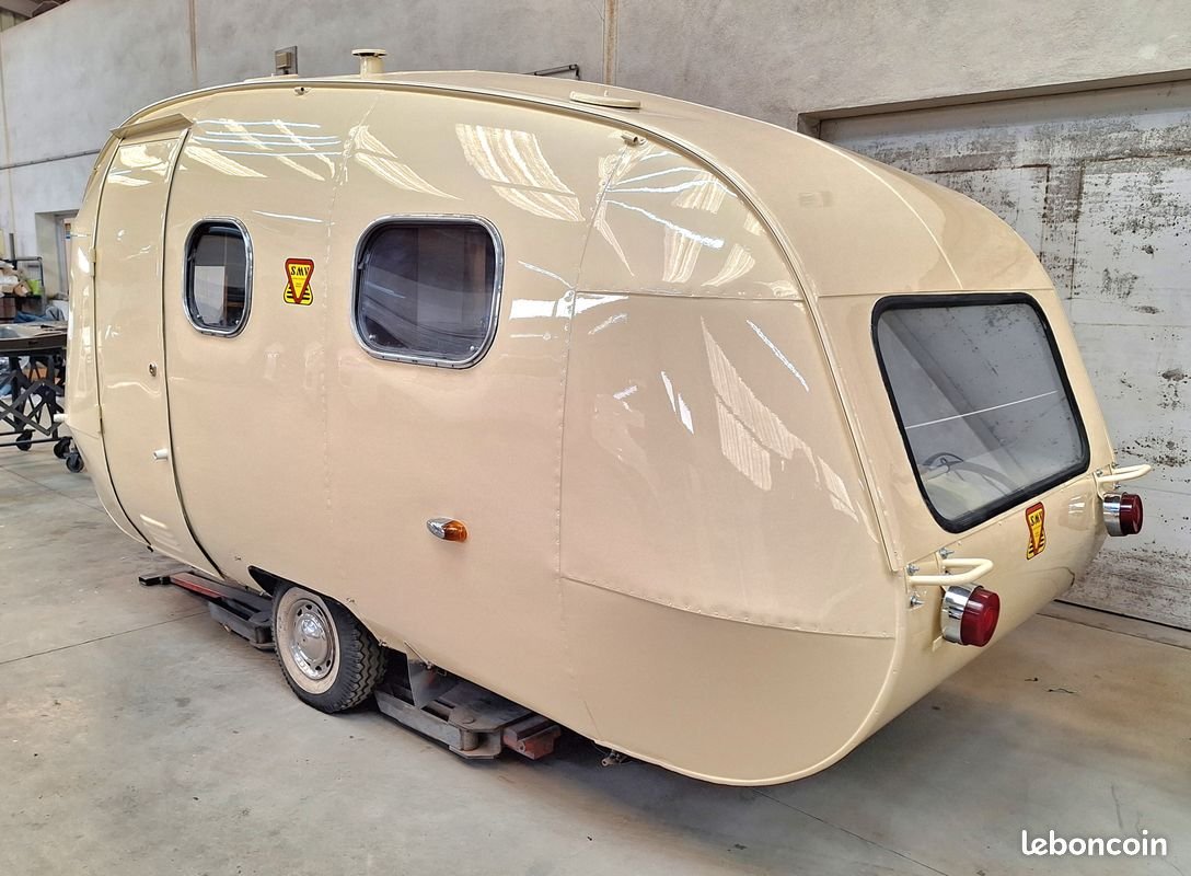 Le seul sur leboncoin en ce moment. Design super original avec beaucoup de courbes. la caravane n’a pas besoin de carte grise en raison du faible poids de 400 kg (aluminium). Alternatif pour une petite Eriba.