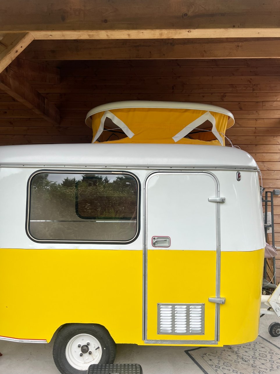 J'ai piqué les gros bras de mon mari pour porter le toit et le remettre sur Sunny (photo extérieure juste posé et élastique dehors...