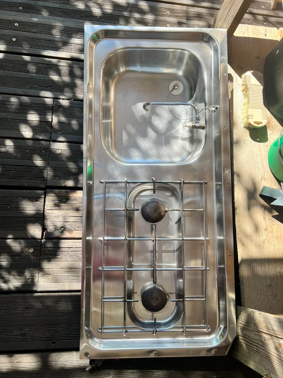 La partie faite est le coin en haut, bon en photo c'est pas foufou mais en vrai c'est beaucoup mieux ! Enfin, trépignant de ne pouvoir plus avancer, ben je décape l'évier pour, je l'espère, une installation dans les prochains jours :
