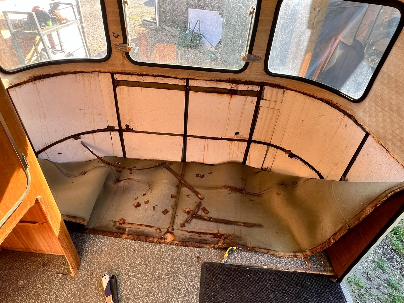 Sans plus de blabla je vous montre le démontage de l'avant. Je prends mon temps pour démonter les meubles qui seront stockés au sec, ils sont en contreplaqué, souvent arrondi et l'assemblage est fait avec des ....clous... mon calvaire, on ne voit pas les têtes, on les devine juste par les taches noires sur les meubles. Pour le démontage je passe un outil entre les deux morceaux de CP et je "coupe" les clous, il y aura un gros travail de réfection des bois mais pour plus tard...