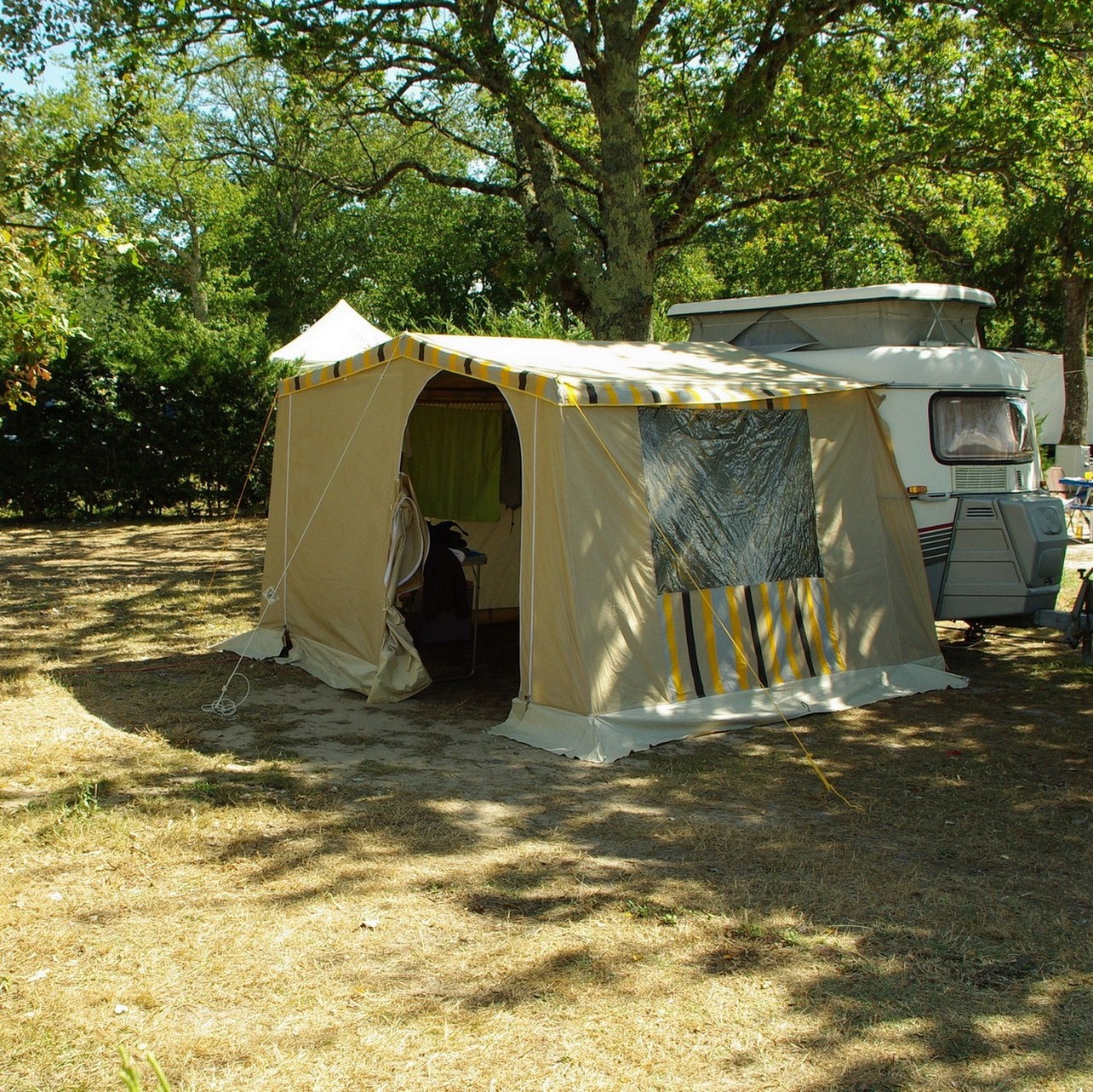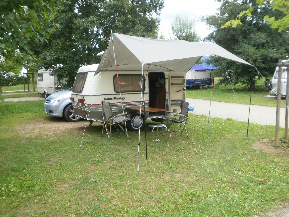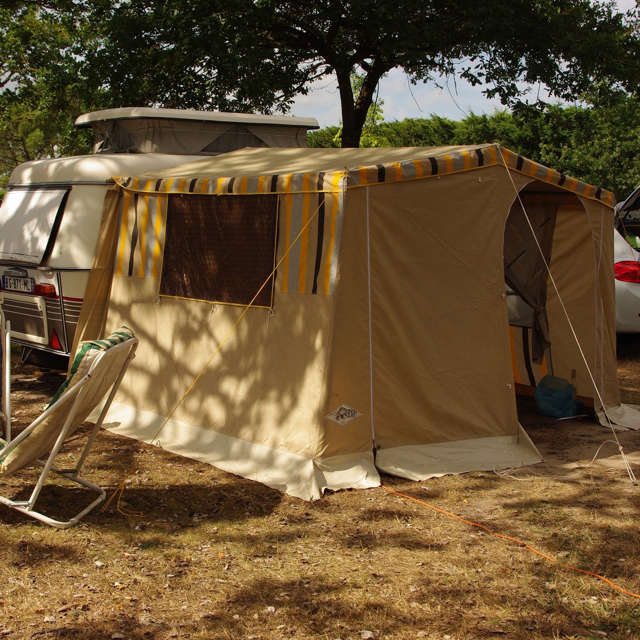 Une fois les vacances terminées et la rentrée digérée, je prends 5 minutes pour poster 1 ou 2 photos de la cagouille avec son auvent, lors des quelques jours de détente au camping de Lanton (bassin d'Arcachon) en post-saison donc super agréable. Après avoir planché style "mais-où-va-donc-ce-bout-là-dis-donc", l'auvent s'est monté en 1/2 heure, donc la prochaine fois, 1/4 d'h.. Super ! Il n'empêche que pour la future virée, 2 nuits en novembre, on a trouvé un système simple style solette pour protéger en cas d'humidité. Je soumets celà à votre perspicacité...