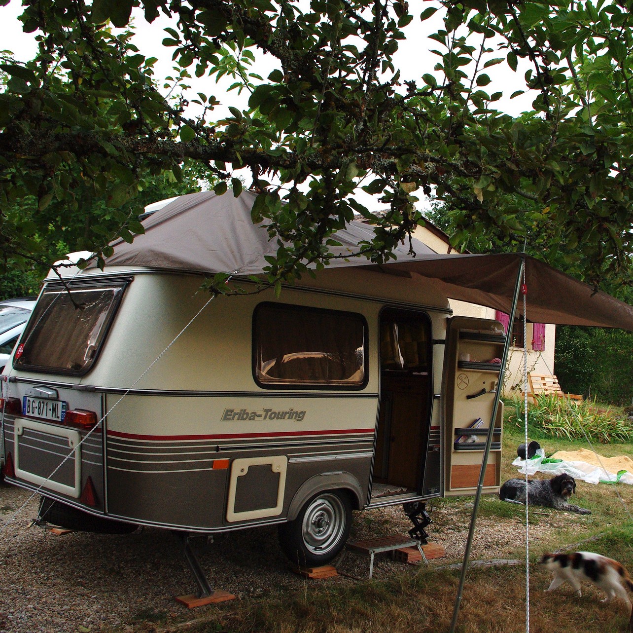 un "tarp", chaque coin attaché à la poignée la plus en arrière par rapport à l'entrée, passée au dessus du toit -et on l'a fait même champignon relevé- et rattaché au pique d'origine. Attention, c'est testé à la va vite (c'est ça les idées fulgurantes...) , l'arbre n'est pas prévu !
