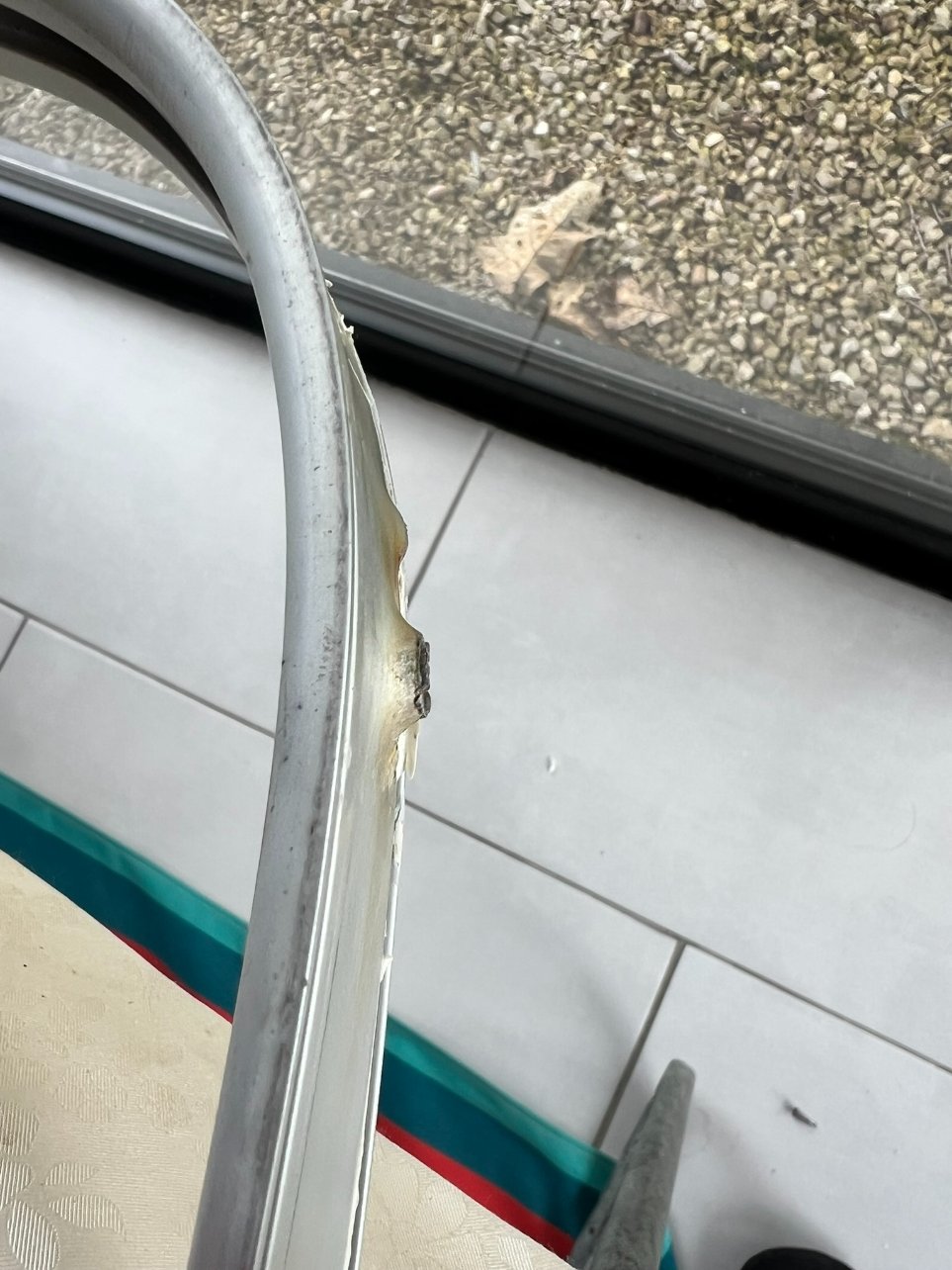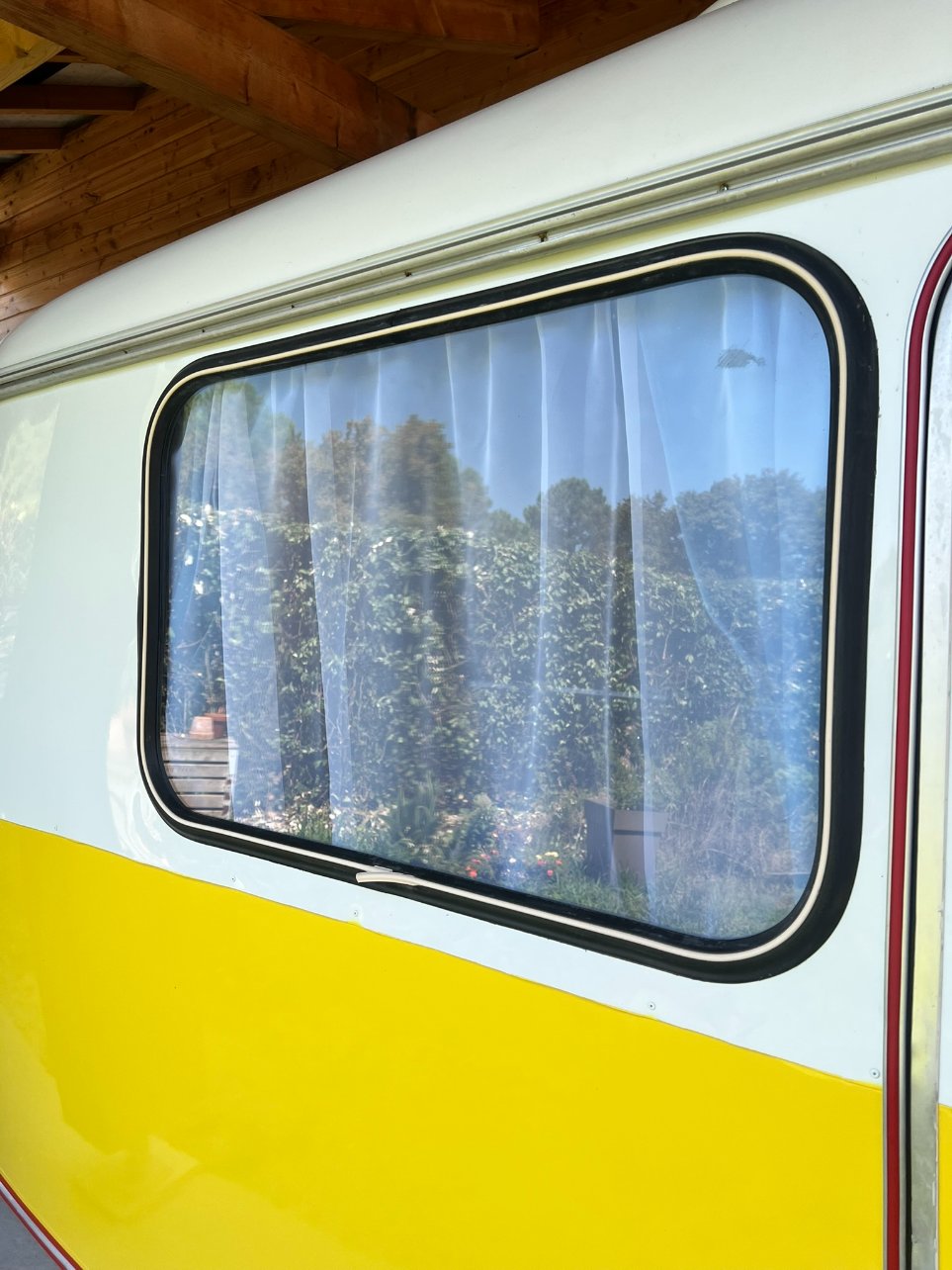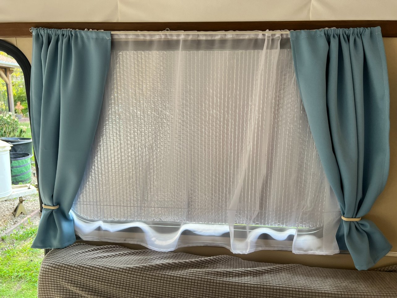 Je vais mettre une cordelette je pense entre les deux pour bien plaquer les rideaux contre et tenir les voilages, c'est en fil de nylon dans ma Coral et je me demande si c'était pas comme ça aussi dans les Eriba? Et comme il faisait bien chaud, je suis allée nourrir les moustiques à côté du jet d'eau (à boire et à manger ils étaient trop contents), j'ai terminé avec les pare-pierres, il m'en restait un à nettoyer complètement et un qui avait été fait l'année dernière donc à refaire, j'avais aussi pas mal de restes de rivets à sortir et la tôle à reformer un peu (aplanir au niveau des trous de rivets), plus que les 2 derniers rails et le décrassage est terminé.