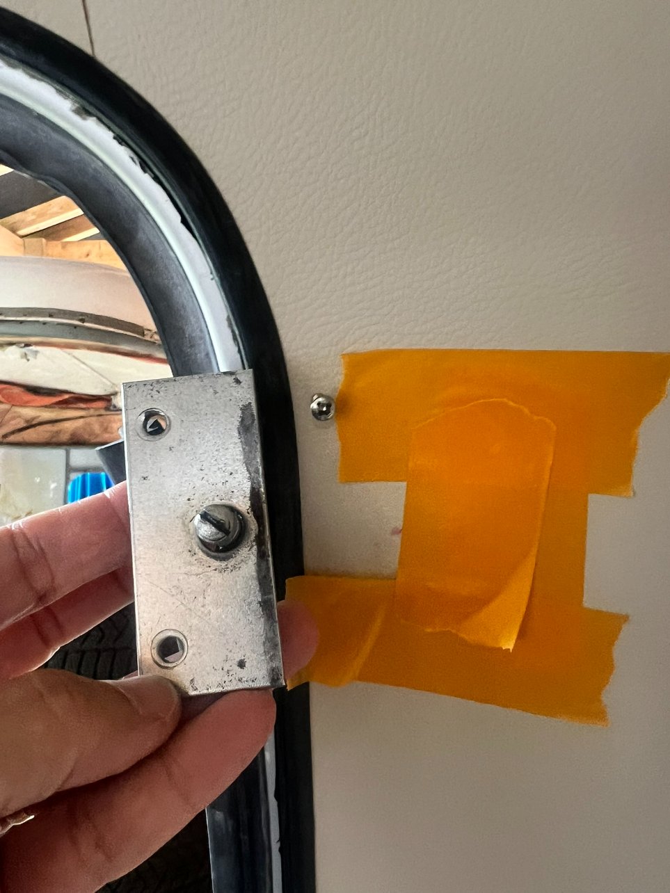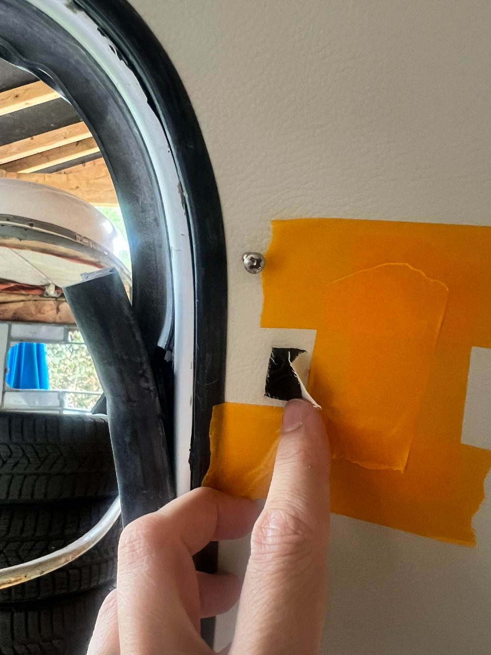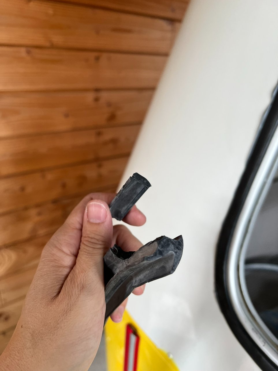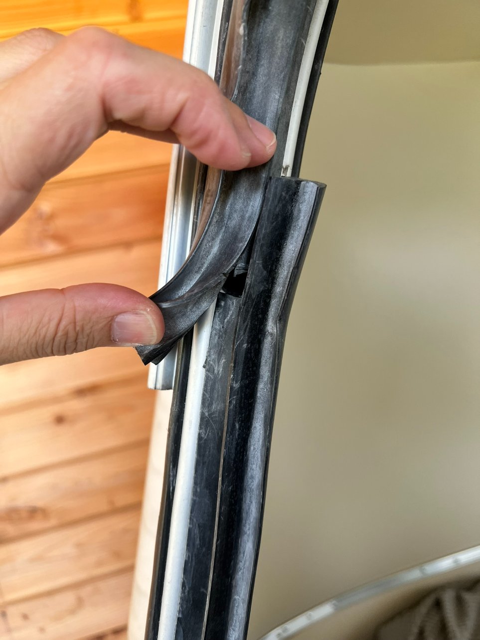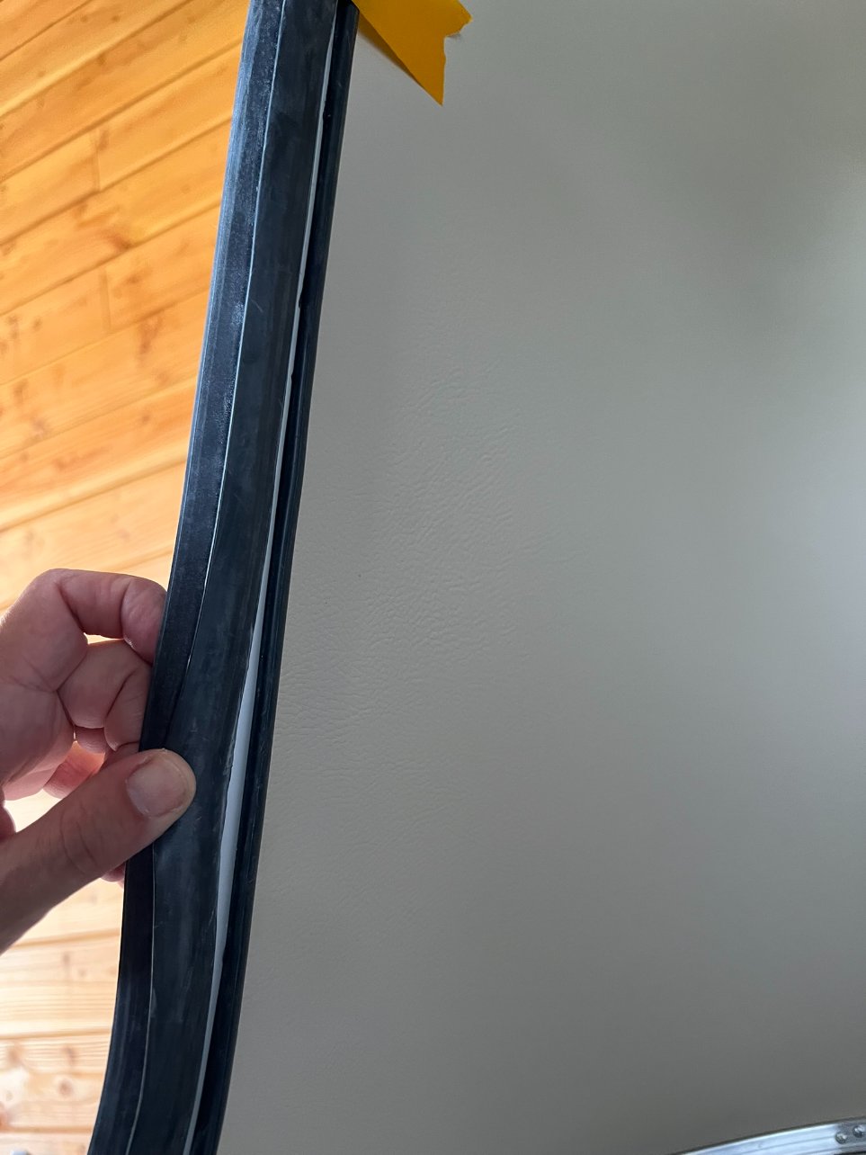 On démarre par un trou de charnière, on met donc la partie du joint qui se dirige vers l'intérieur de la caravane et on fait tout le tour (jusqu'à l'autre charnière). Puis on prend un tournevis plat (j'ai ensuite piqué un outil en plastique à mon mari pensant que ce serait plus facile, mais au deuxième joint je suis revenue au tournevis plat), on appuie sur le petit bourrelet pour qu'il rentre dans la goulotte, une fois bien en place, le joint ne bouge plus. On avance très lentement et puis à un moment on trouve ça facile, on prend confiance et un petit coup d’œil dans la caravane pour voir que si c'est facile, c'est juste parce que ça part en cacahuète...