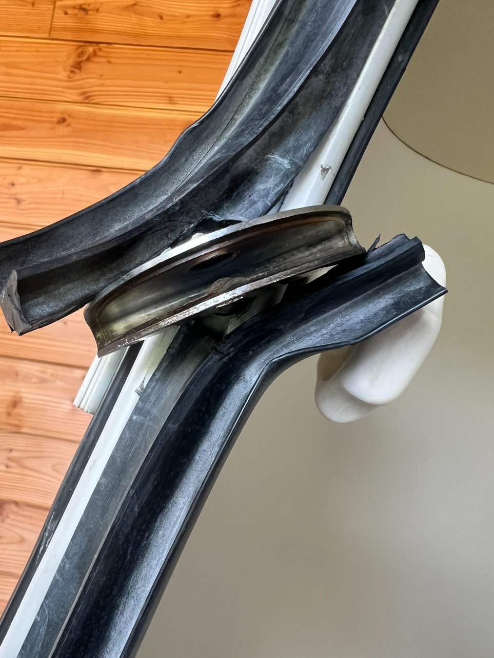 Je l'ai donc fait un peu plus grand que celui d'origine, de la taille que préconisait Jean-Pierre et j'ai donc coupé toute la longueur, puis j'ai enlevé les rainures pour être sûre qu'il se plaque bien. Un copain (qui m'a donné ce jonc) l'a fait sur sa Puck et il m'a conseillé de faire ainsi, je m'exécute. Ensuite je le fixe à l'intérieur, pour le test un peu de scotch double face et des pinces à linge le temps que ça prenne.