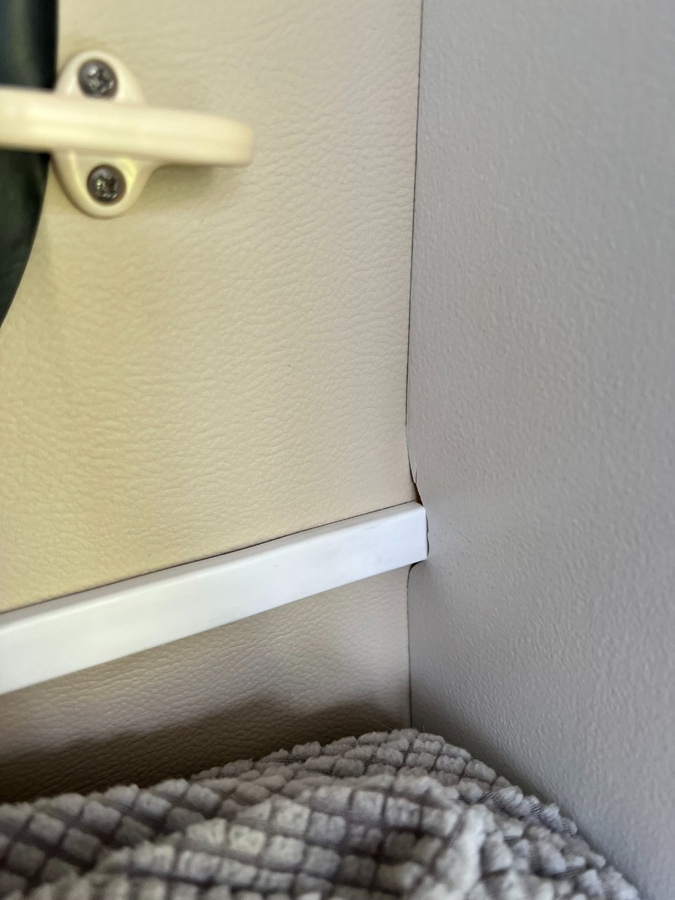 J'ai ensuite posé la dernière finition haute que je n'avais pas terminé, il me restait à poncer les bouts pour que ça rentre bien (mauvais gestion de l'arrondi à l'avant) et j'ai posé en suivant les portemanteaux et attaches rideaux (car ils maintiennent le chant plat aussi).