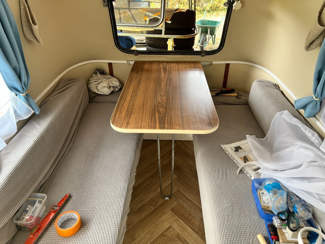 Cette table, sans tablette arrière, parait tellement petite et enfoncée, bon pas très grave car je doute qu'on y mange un jour.... et plus je suis dedans et plus je me dis que c'est une caravane de célibataire