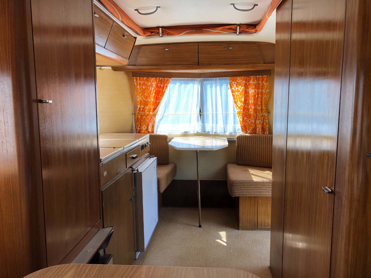Elle est dans son bon jus d'origine puisqu'elle n'a pas été utilisée depuis 20 ans et à part un traitement du châssis à prévoir et le remplacement d'un tube de structure à l'avant, elle est très saine et surtout conforme avec toutes ses options d'époque présentes sauf la toile du auvent Solvac Holiday qui n'a pas été sauvée mais l'armature est présente.