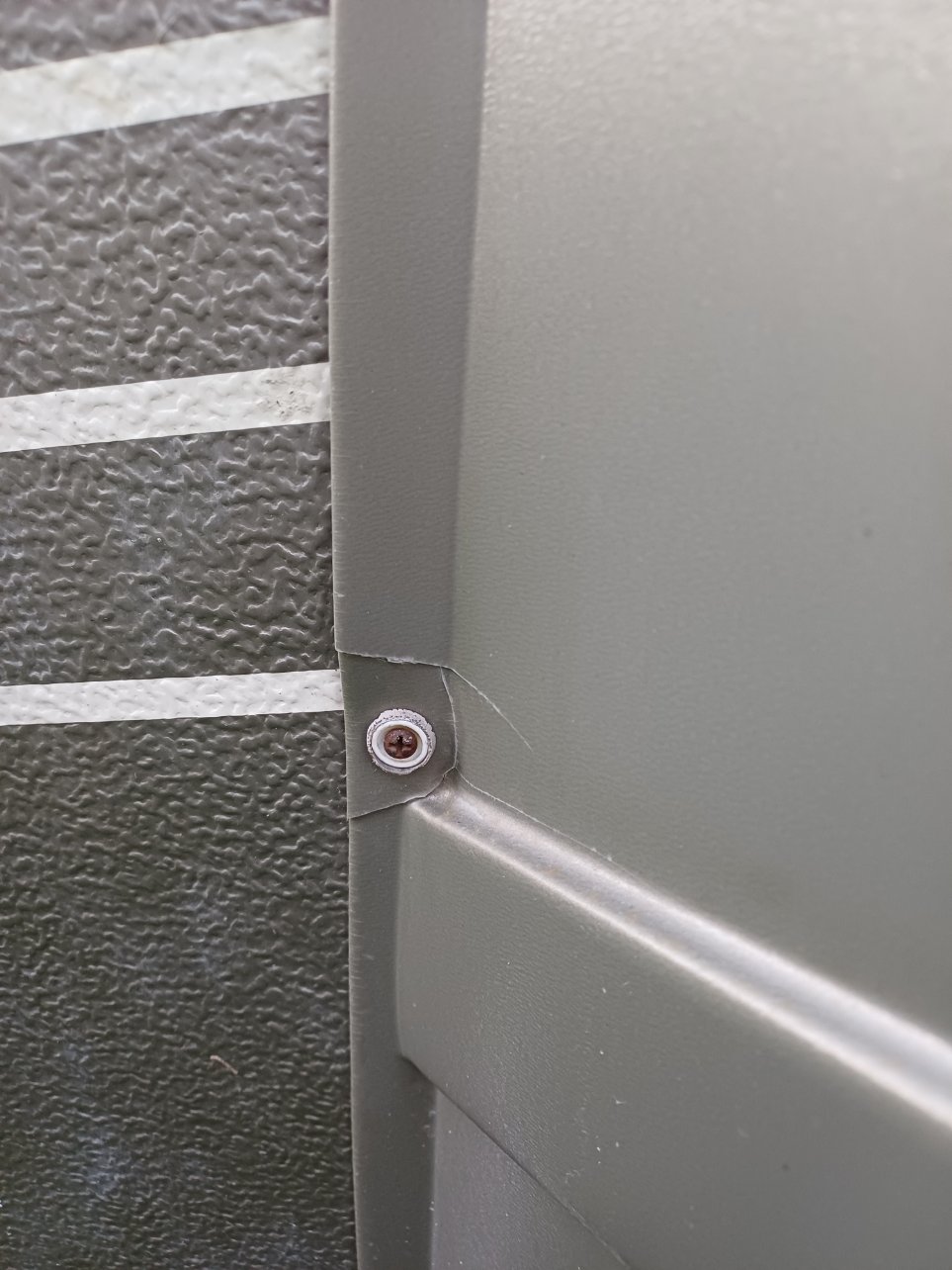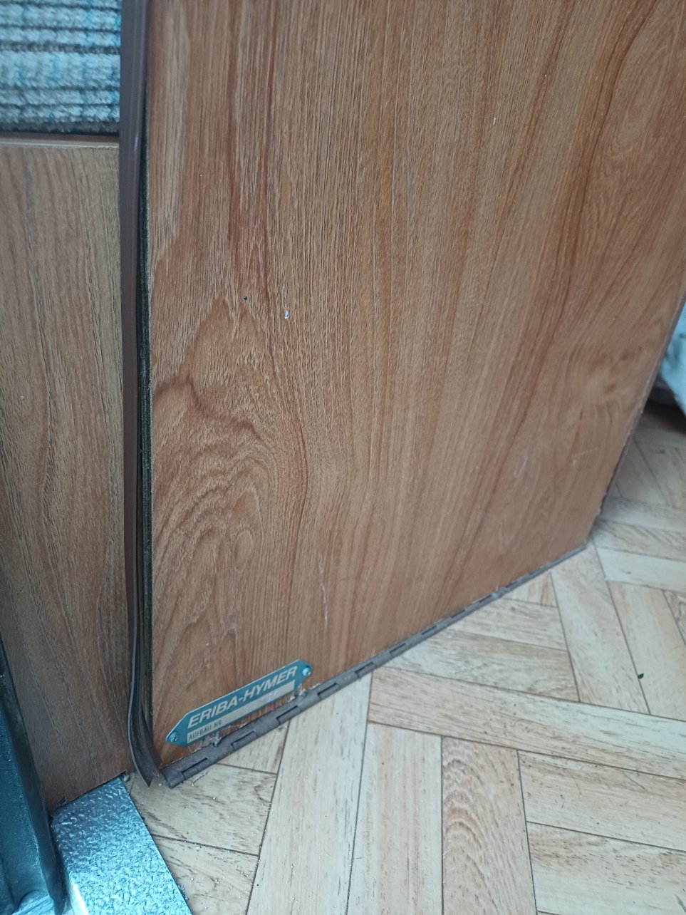 La tablette de pied de la couchette côté porte n'est plus fixée à la charnière , l'habillage du chant ne tiendra plus