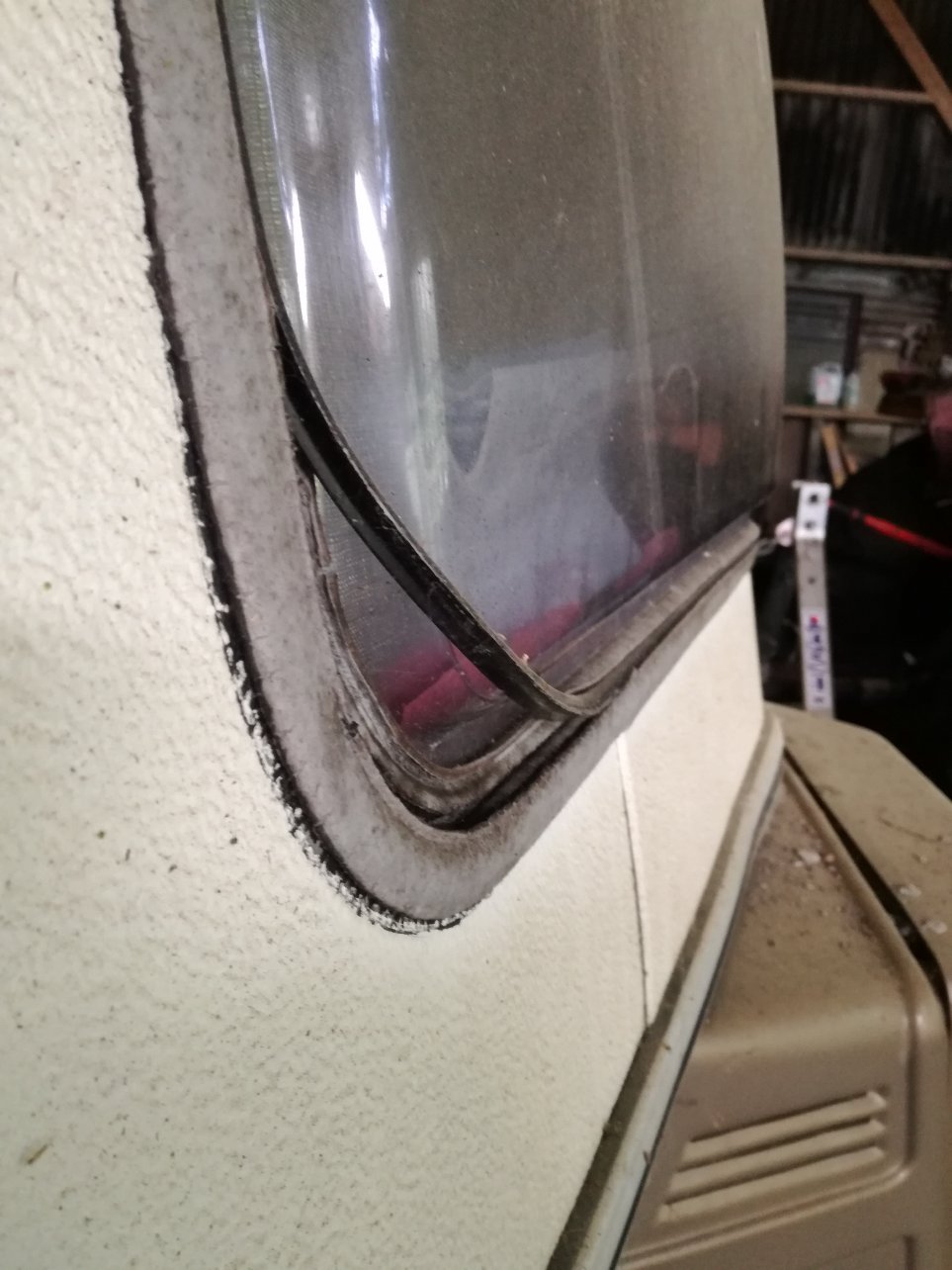J'ai attaqué mon problème de corrosion autour de la baie. J'ai passé un généreuse couche de Rustol sur le tube depuis l'intérieur. Par contre il est clair que la baie n'est pas étanche, elle fait aquarium et quand on fait bailler le joint depuis l'intérieur à un endroit on voit le jour