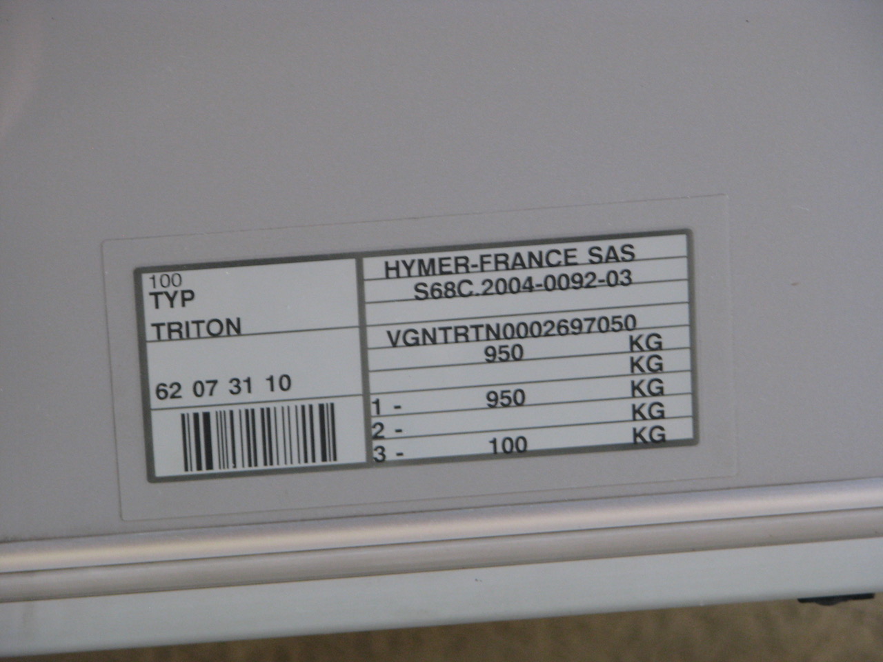 Je crois que je n'ai pas communiqué lors de ma présentation le n° de notre Triton 420 GT achetée l'été dernier : 62044312. La date de 1ére immatriculation par le précédent et premier propriétaire est le 11/05/2004. J'enverrai une photo de la plaque d'ici 2 à 3 semaines lorsque j'irai faire prendre l'air à ma cagouille qui est actuellement à l'abri pour l'hiver.