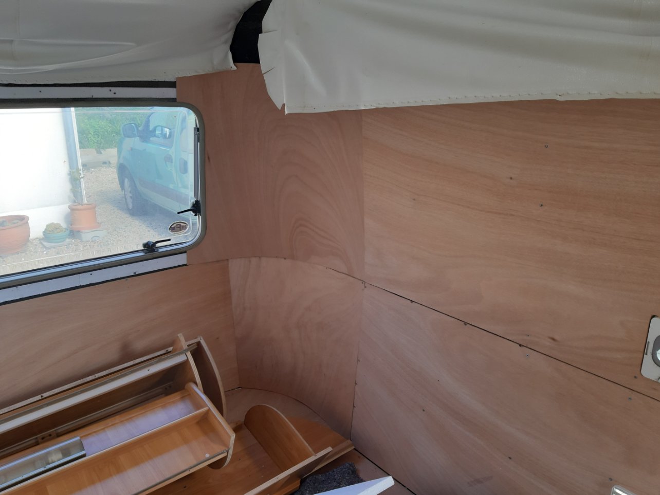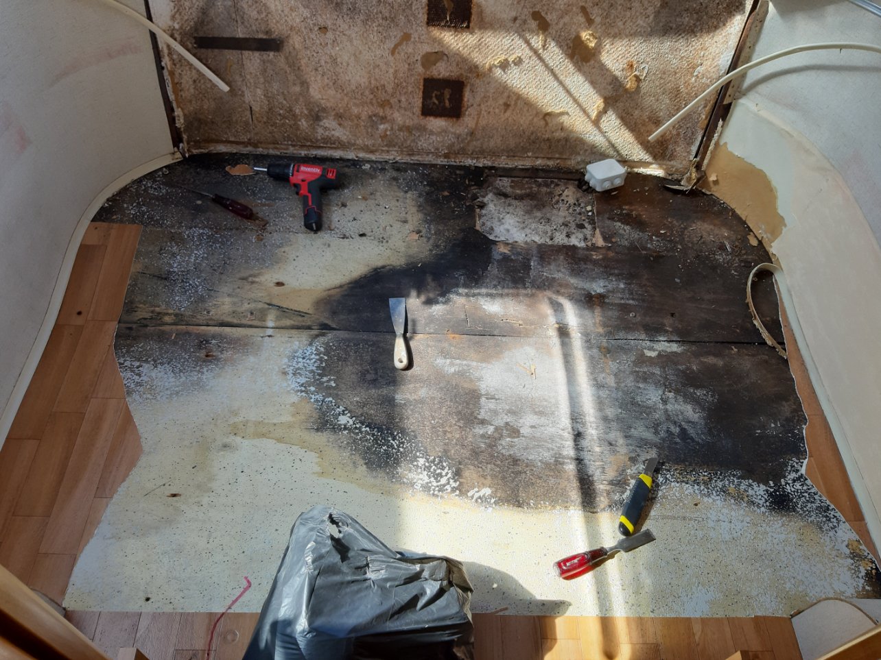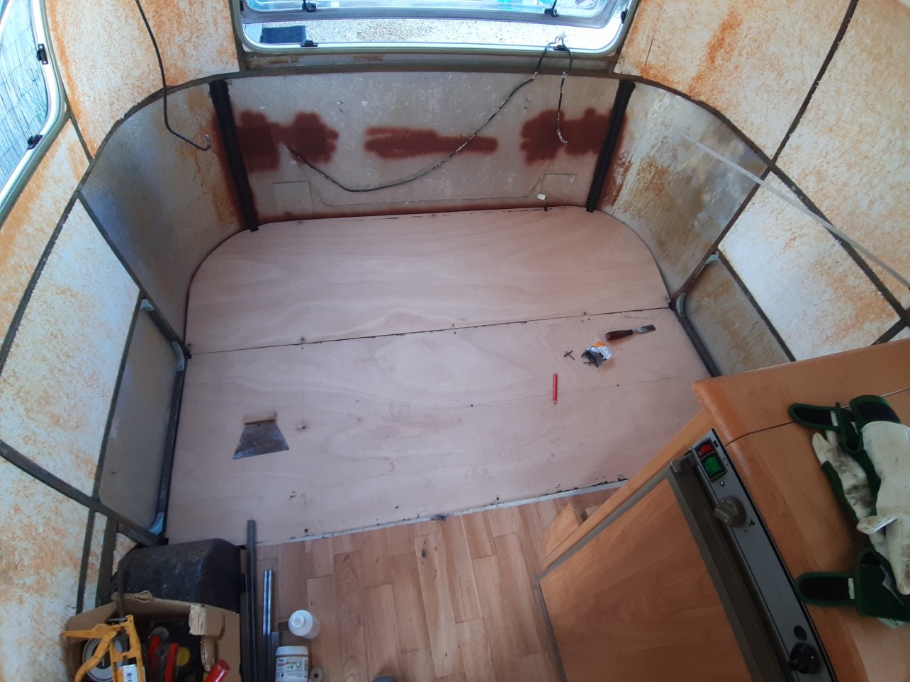 Nous sommes les futurs heureux propriétaires d'une Familia BS de 96. Je dis futurs car dans notre précipitation et enthousiasme d'avoir enfin trouvé notre Ginette...nous sommes passés à côté de problèmes d'humidité...Après recherche et démontage, nous avons donc entamé une remise à niveau... Démontage et réfection complète du plancher arrière depuis les roues, après avoir remplacé quelques tubes de l'ossature. Nouvelles isolation et placage de CP ext de 3mm sur l'ensemble. Nous en sommes là. Prochaines étapes : Choix du revêtement, soit de la fibre ou du revêtement rénovation à base de cellulose (vous feriez quoi ?) puis peinture acrylique. Remplacement des joints des fenêtres, pour le sol un vinyle encore en cours de choix. Nous allons ensuite fabriquer un lit 2 places permanent à l'arrière et réfection des coussins de la dinette. A bientôt sur les routes.