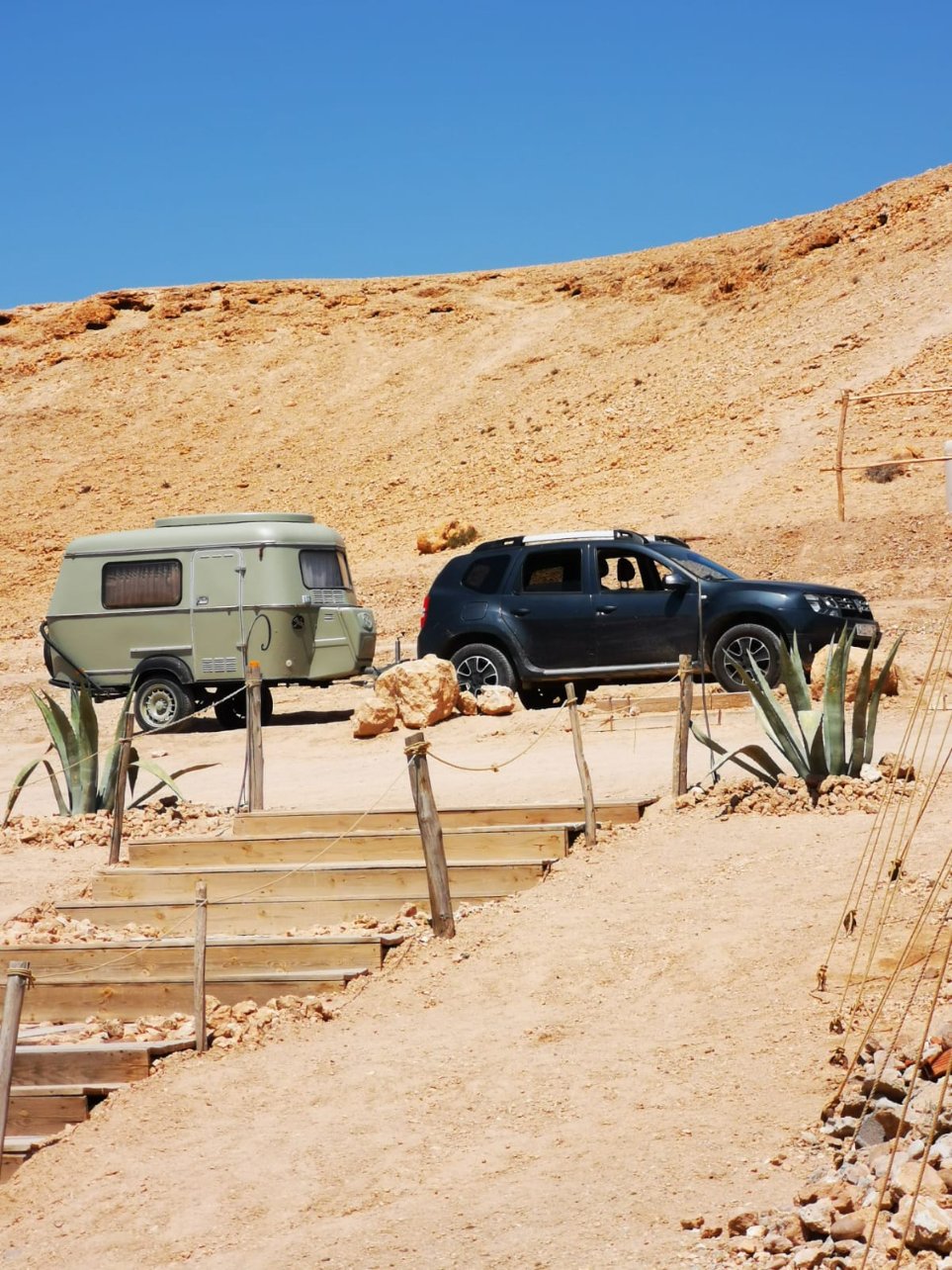 En ce qui concerne la caravane : Il s'agit d'une Eriba Puck de 1987 (je crois ??) , légèrement transformée pour pouvoir l'emmener sur les pistes les plus "cassantes" du Maroc. Le "tracteur" - ici mon Duster - varie en fonction du trip effectué