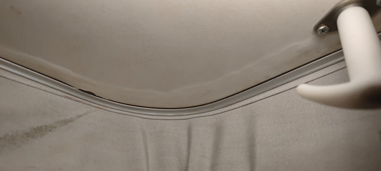 Voici quelques photos (avec une lumière rasante ça ressort bien) : La toile est aussi bien tachée à cet endroit et cela ne date pas d'hier. Lors du gros orage il y a quelques jours, la toile n'étais pas mouillée (toit baissé) : Quand il pleuvait j'ai passé la main derrière (au niveau du raccord entre le profil alu et le toit en résine) mais n'ai pas senti d'eau...
