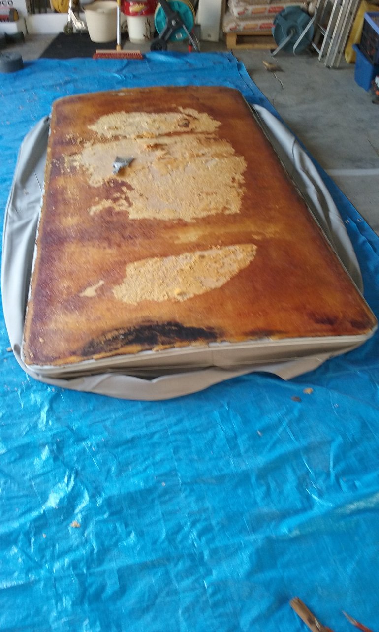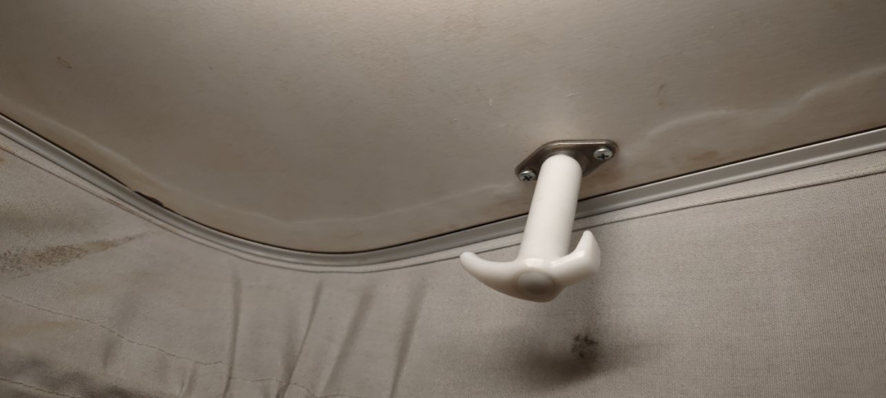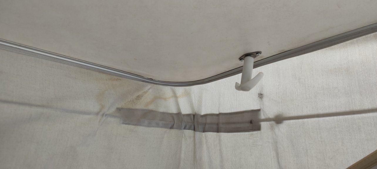 Donc quand j'ai refait le la toile, j'ai constaté aussi des petites imperfections sous le toit. Plus particulièrement un de des crochets de toit qui était rouillé à sa base. Aussi j'avais des petites auréoles au même niveau. Mon toit aussi n’était pas concave mais plat car il commençait à se décoller au niveau des cotés.